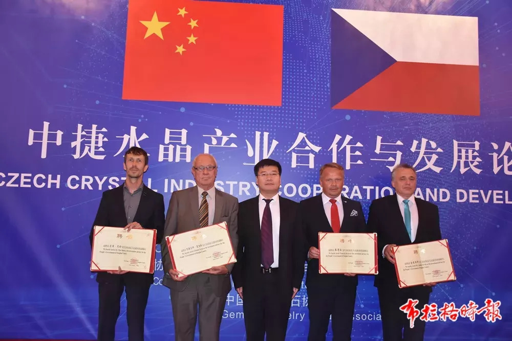 东海县委书记朱国兵为捷克工贸部前司长思德尼克•克里斯、凯米斯基市市长库奇拉、捷克水晶大师舍谱琴科、捷克原创水晶董事长皮特•巴伦等4名招商顾问颁发了聘书。