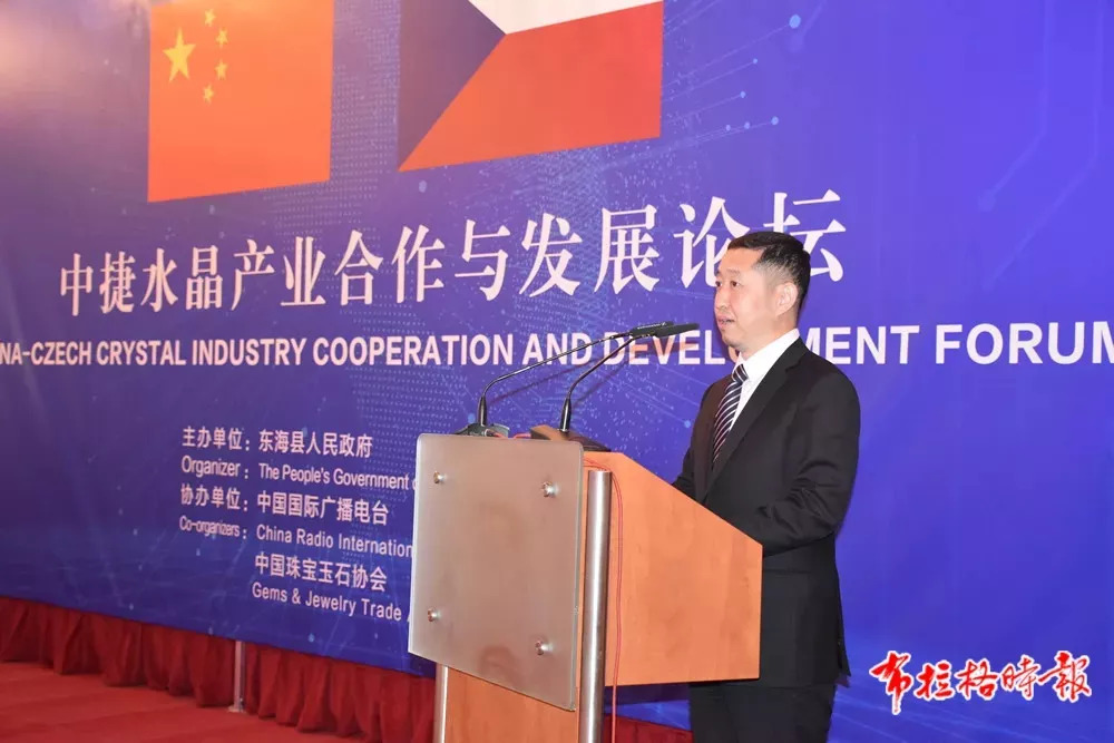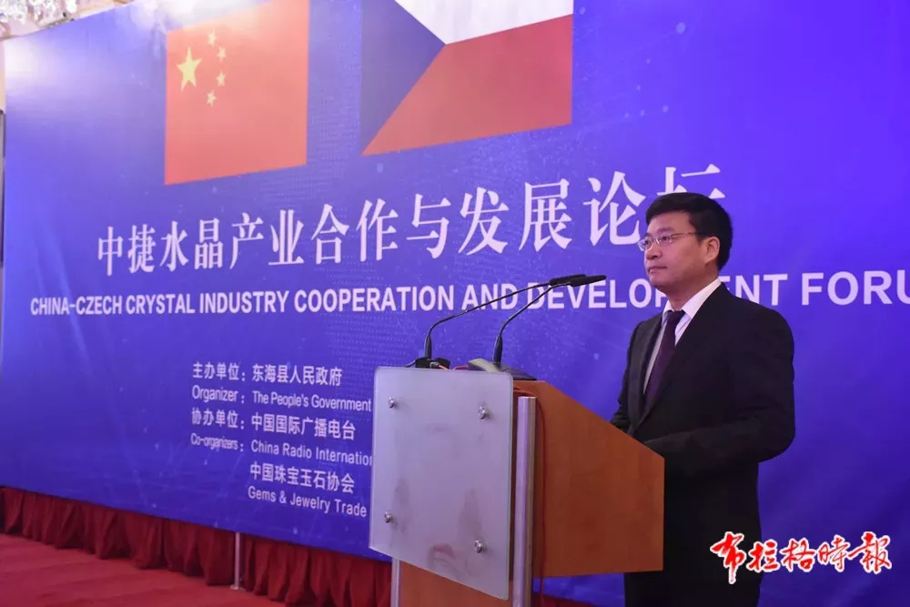 东海县委书记朱国兵在主旨发言中简要回顾了东海—捷克的合作发展历程以及合作成果,他指出,东海与捷克开展合作,是落实国家“一带一路”战略的具体举措,东海将坚持扩大开放,全面深化与捷克在水晶产业上的合作关系:引进一批捷克水晶大师,提升东海水晶设计创意水平,选派一批留学生到捷克深造,培养水晶制作年轻人才。为捷克企业搭平台,共建1000亩的中捷水晶文化产业合作园,招引更多捷克水晶制造企业落户东海;为捷克产品搭市场,