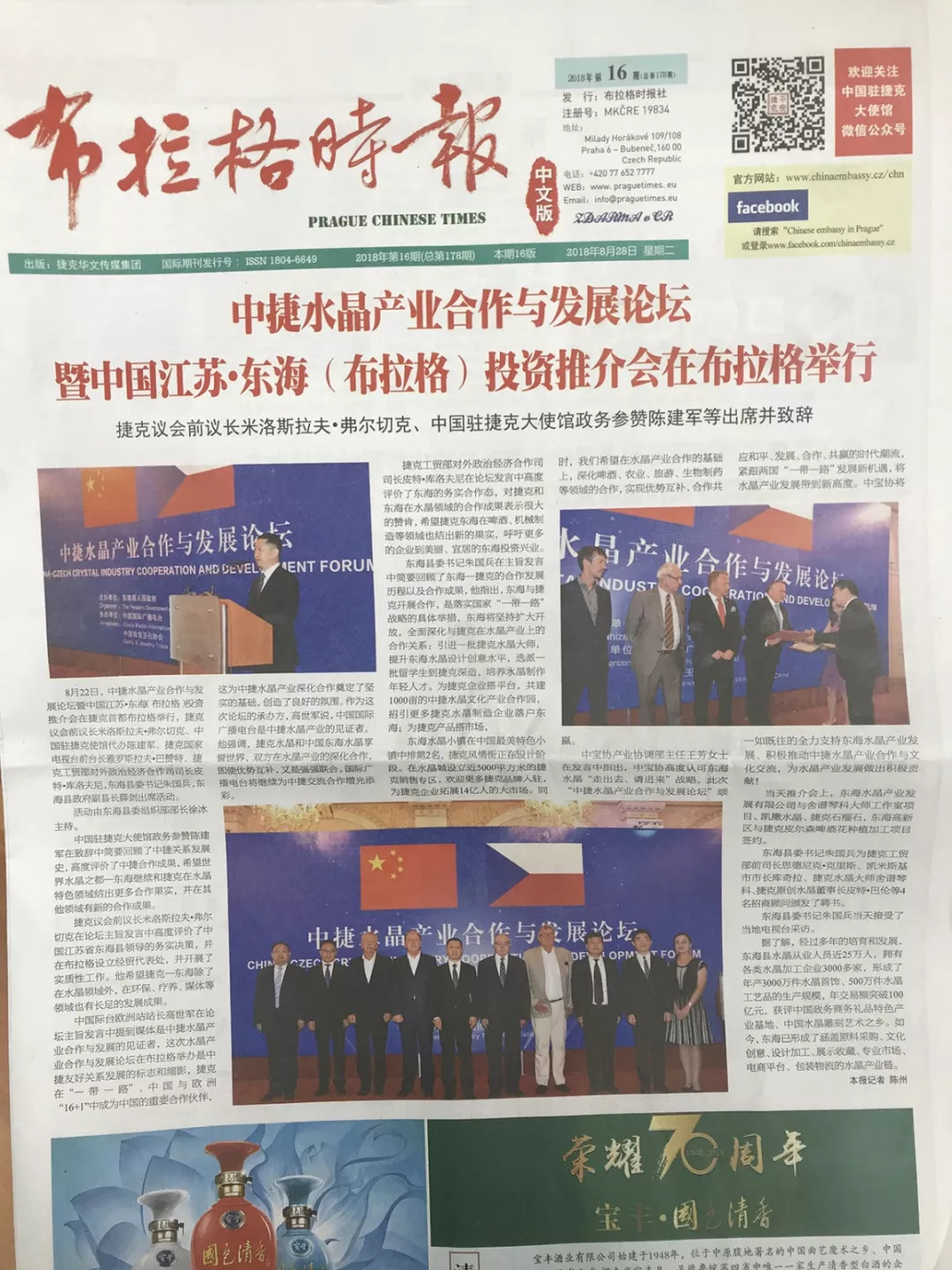 围观了!中捷水晶产业合作与发展论坛暨中国江苏•东海(布拉格)投资推介会在布拉格举行,登上布拉格时报中文版,2018年第16期。