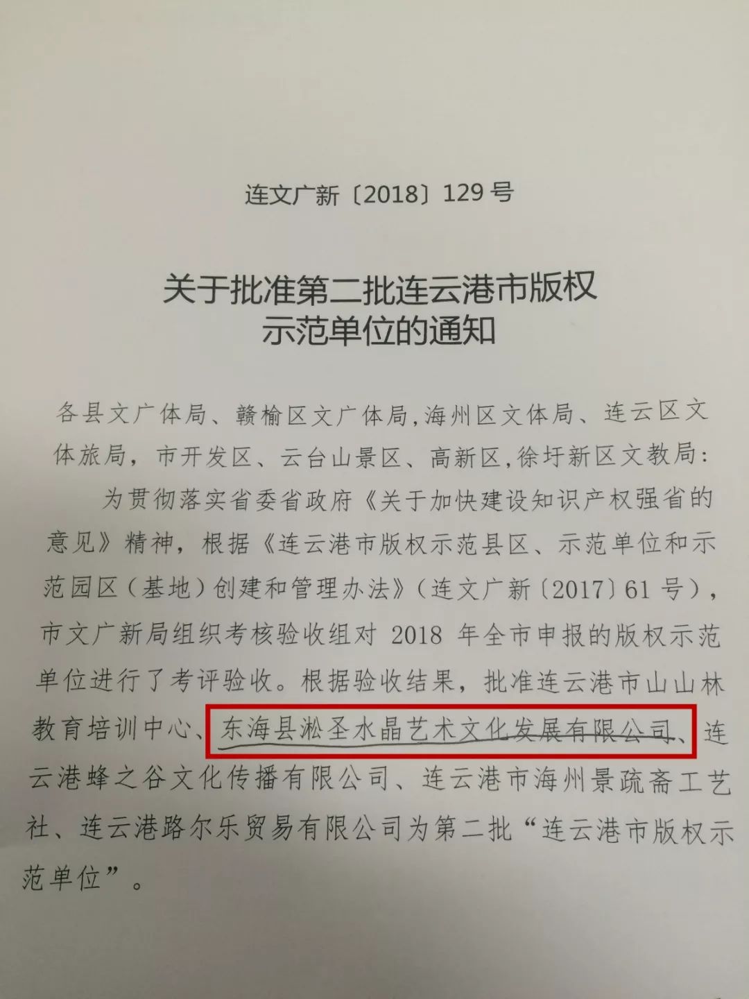 近日,连云港市文广新局根据验收结果,批准东海县淞圣水晶艺术文化发展有限公司、连云港市山山林教育培训中心等五家单位为全市第二批版权示范单位。