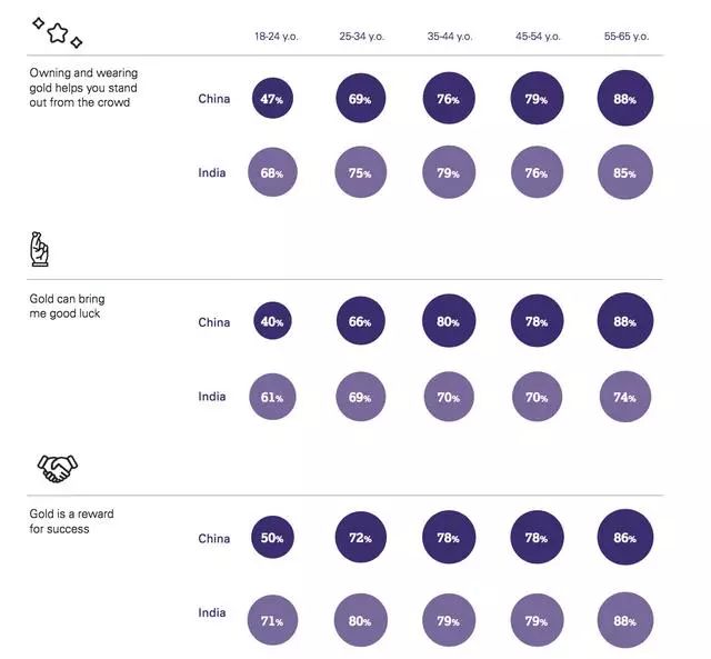 下图:中国和印度不同年龄层消费者对于黄金珠宝的看法(能增加时尚度、能带来好运、作为成功的奖励)