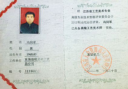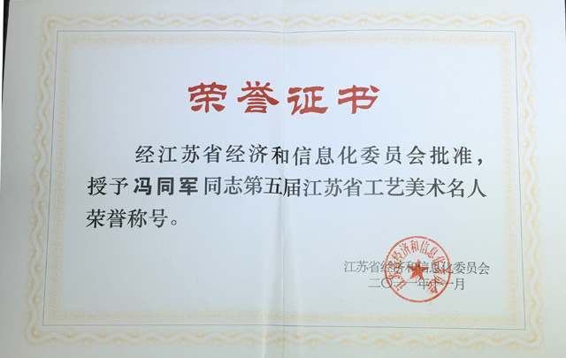 冯同军,男,1968年3月2日生,江苏东海人,江苏省工艺美术名人、高级工艺美师,从事工艺美术工作30多年,先后获国家和省级奖项30项,省级刊物发表论文2篇。