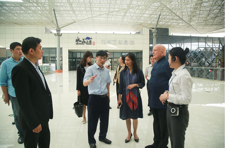 李瑞智一行边走边看、边看边听,不时对水晶小镇建设取得的成绩表示赞赏。在电商双创基地,考察团驻足问询,聆听介绍。