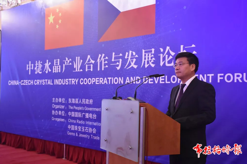 东海县委书记朱国兵在主旨发言中简要回顾了东海—捷克的合作发展历程以及合作成果,他指出,东海与捷克开展合作,是落实国家“一带一路”战略的具体举措,东海将坚持扩大开放,全面深化与捷克在水晶产业上的合作关系:引进一批捷克水晶大师,提升东海水晶设计创意水平,选派一批留学生到捷克深造,培养水晶制作年轻人才。为捷克企业搭平台,共建1000亩的中捷水晶文化产业合作园,招引更多捷克水晶制造企业落户东海;为捷克产品搭市场。