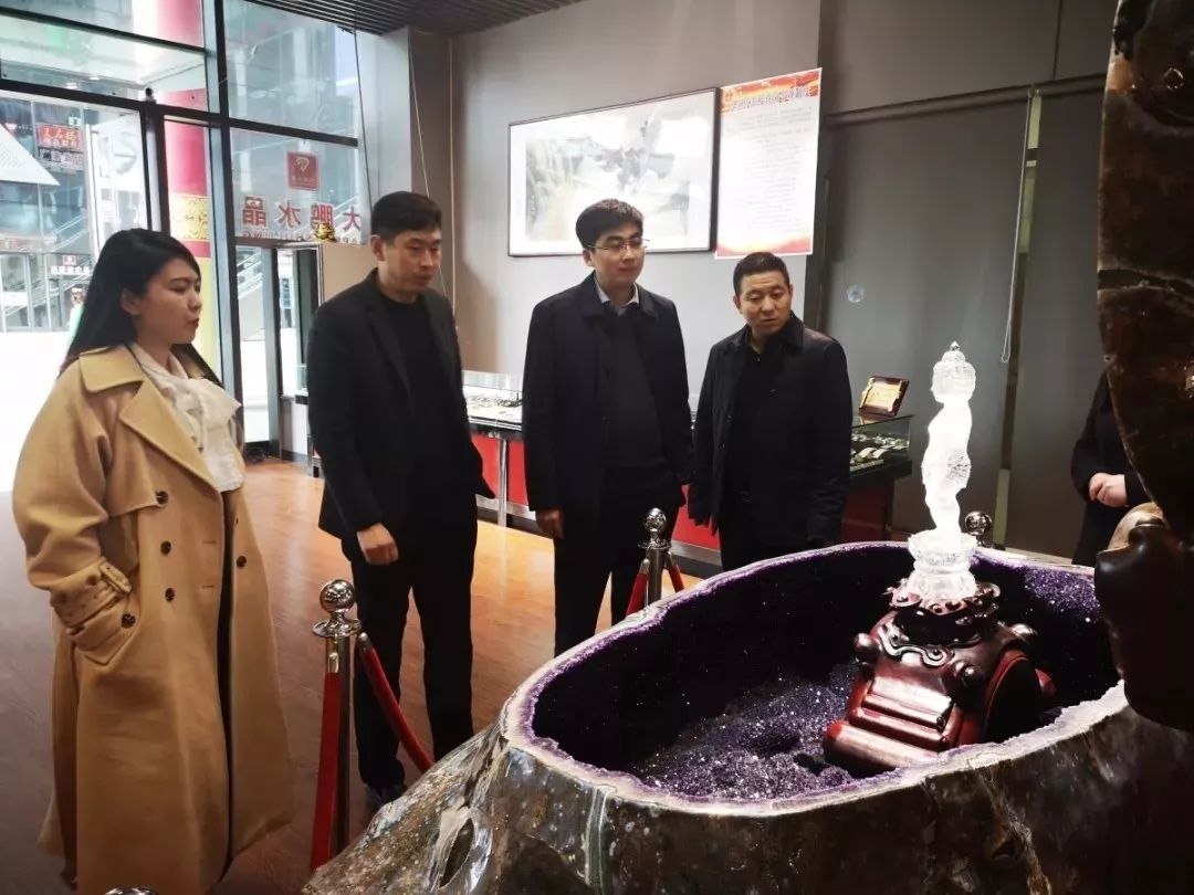 考察组随后来到水晶城柜台区、电商双创基地,一路走、一路看、一路听,不时与商家交流,实地感受到了水晶产业发展的速度和热度。