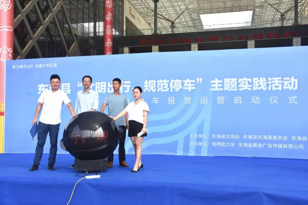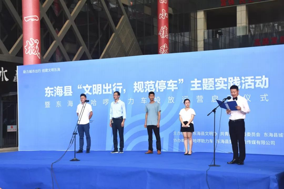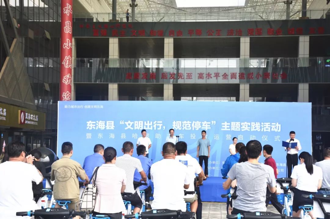 7月26日上午,东海县“文明出行,规范停车”主题实践活动暨东海县哈啰助力车投放运营启动仪式在中国东海水晶城举办。东海县文明办主任谢为民、团县委组织部部长张倩、县城市管理局市容科科长张联军、哈啰助力车负责人丁磊及热心、积极参与文明出行活动的市民朋友参加启动仪式。