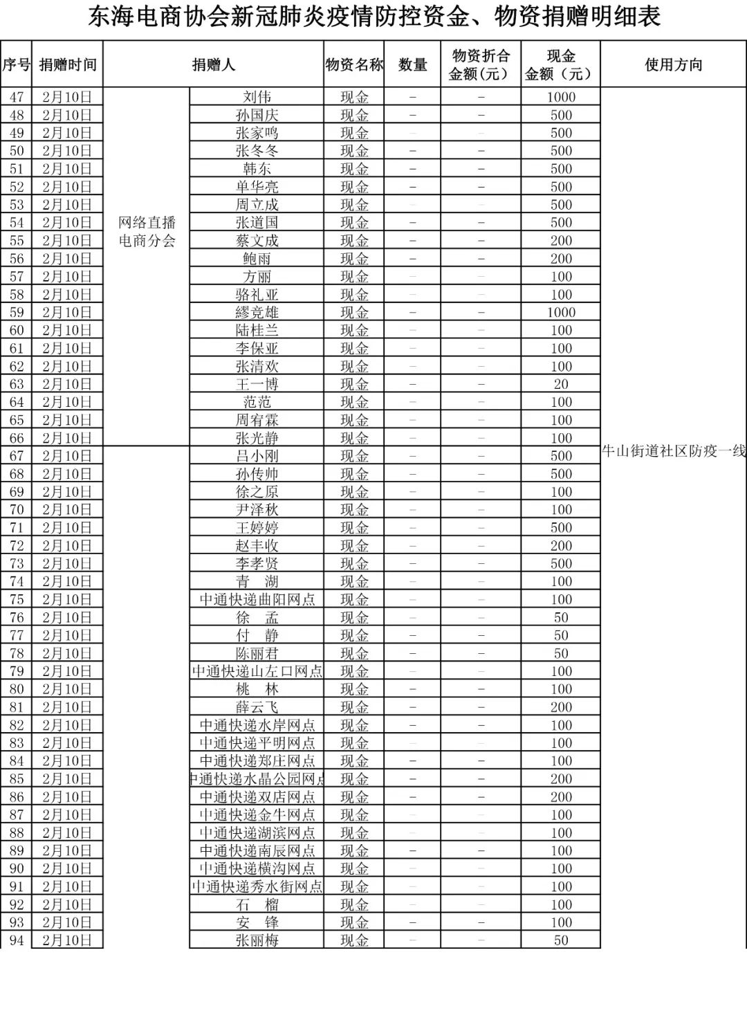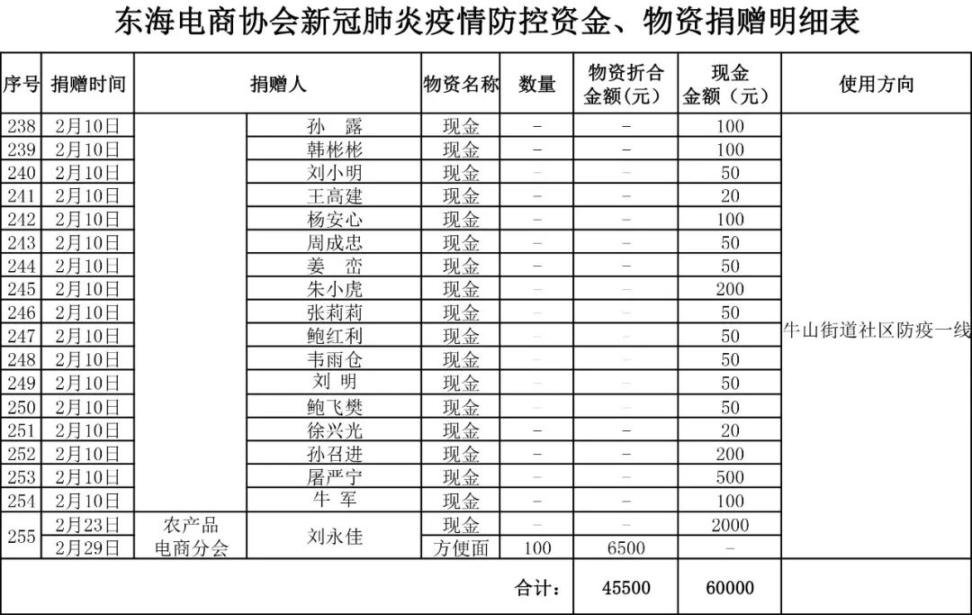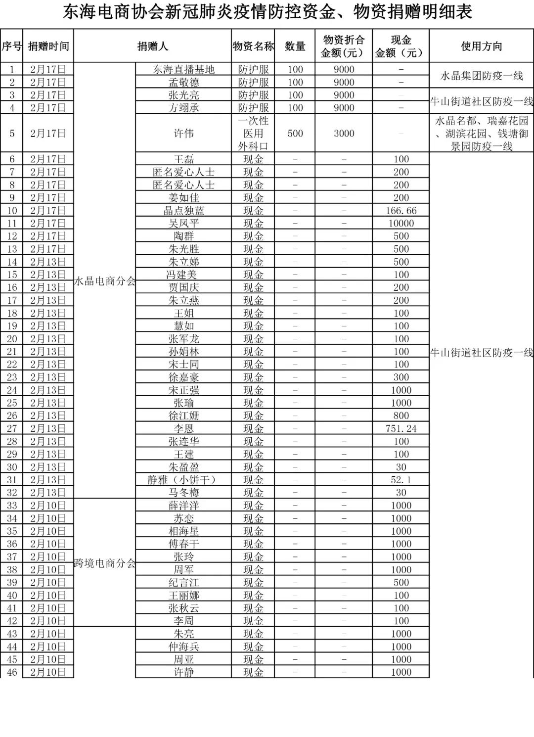 自1月29日东海县电商协会发布疫情防控工作倡议书以来,各电商分会根据自身情况发挥职能作用,充分保障快递服务、农产品与应急物资供给,在东海县电商协会带领下,水晶电商分会、跨境电商分会、网络直播电商分会、快递电商分会、农产品电商分会纷纷“慷慨解囊”,捐款捐物,截止目前,共有200余人参与,捐赠现金60000元,物资折合金额45500元。明细公示如下: