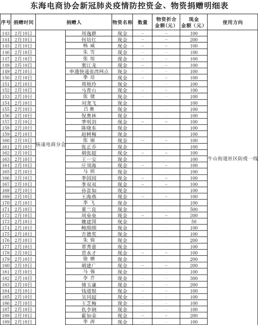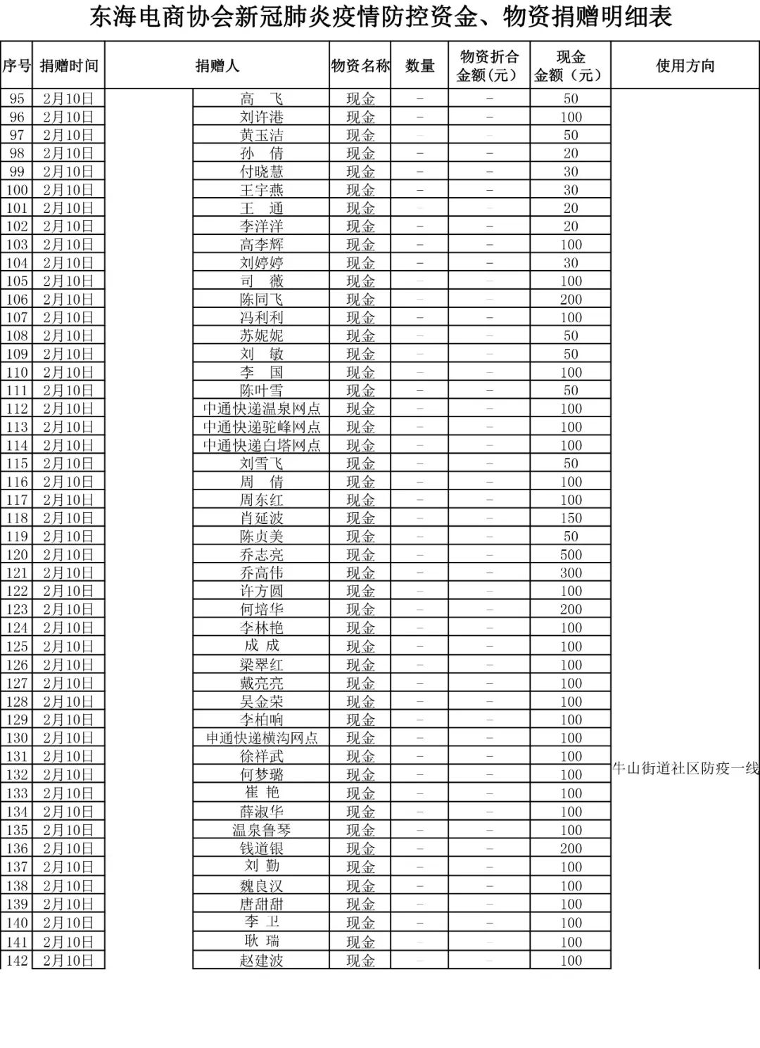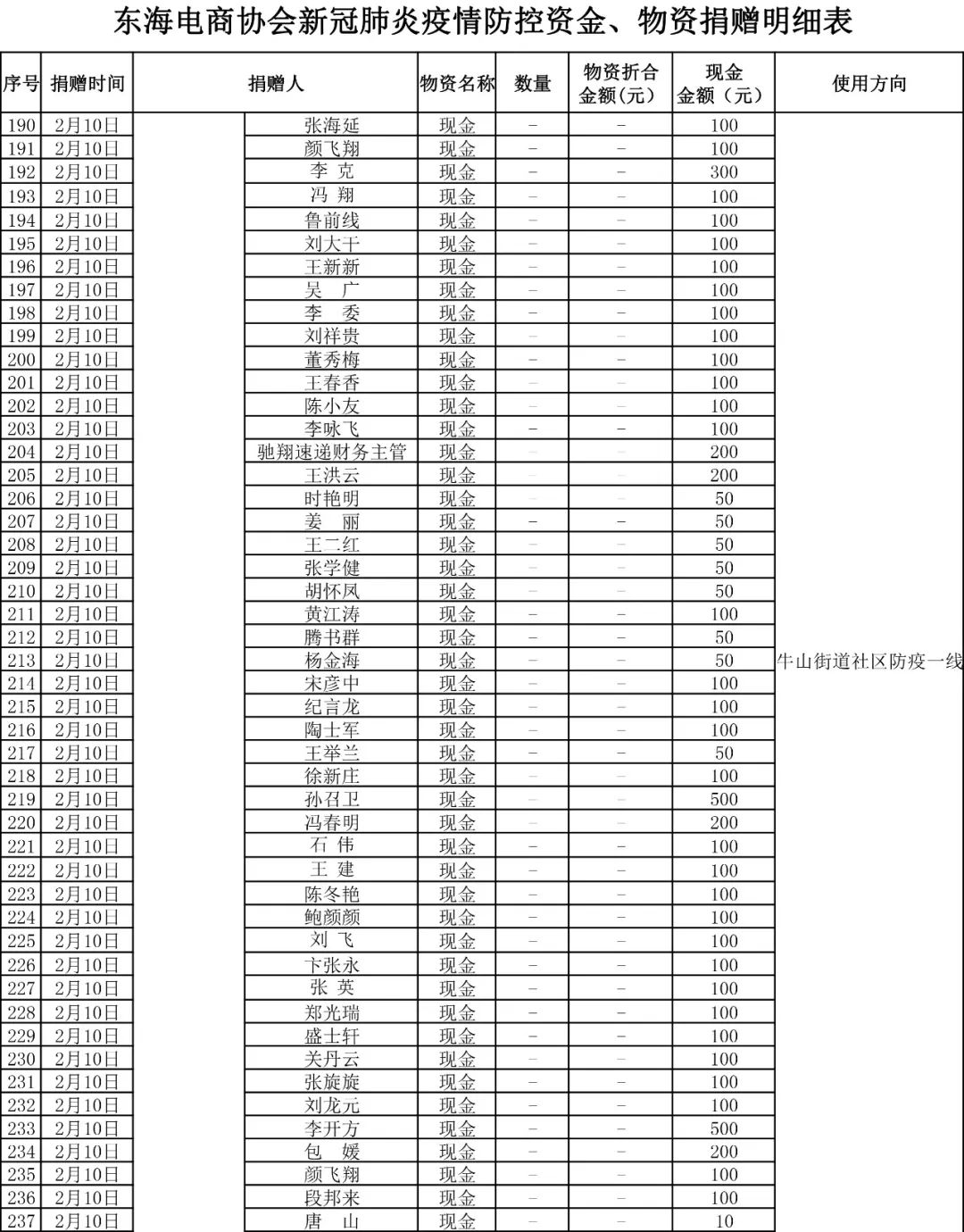 自1月29日东海县电商协会发布疫情防控工作倡议书以来,各电商分会根据自身情况发挥职能作用,充分保障快递服务、农产品与应急物资供给,在东海县电商协会带领下,水晶电商分会、跨境电商分会、网络直播电商分会、快递电商分会、农产品电商分会纷纷“慷慨解囊”,捐款捐物,截止目前,共有200余人参与,捐赠现金60000元,物资折合金额45500元。明细公示如下: