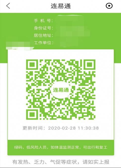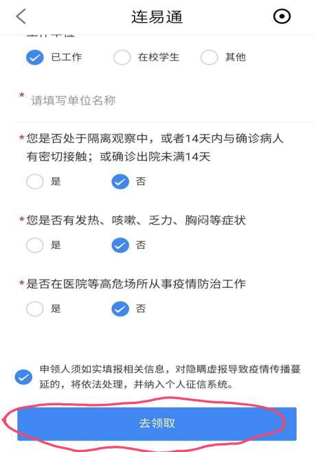 四、点击“去领取”,系统自动生成个人专属“连易通”健康码。