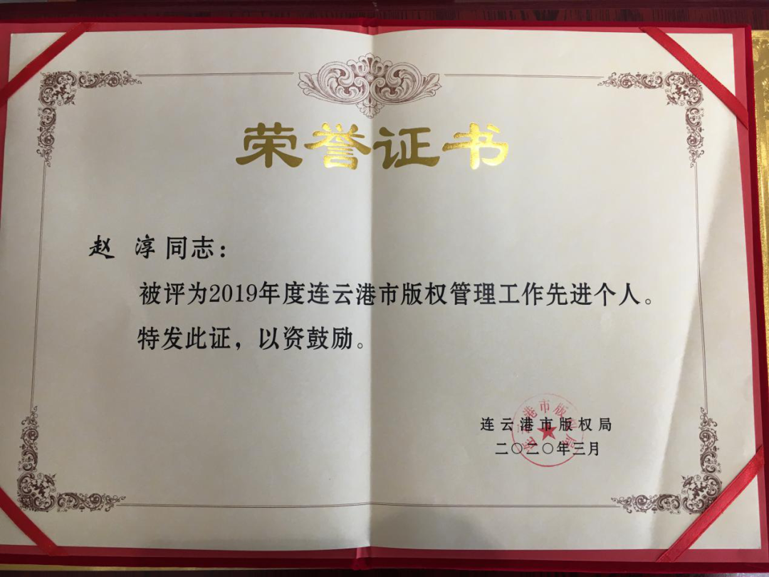 近日,水晶集团获评“2019年度连云港市版权管理工作先进集体”,集团党委委员赵淳同志荣获“2019年度连云港市版权管理工作先进个人”。