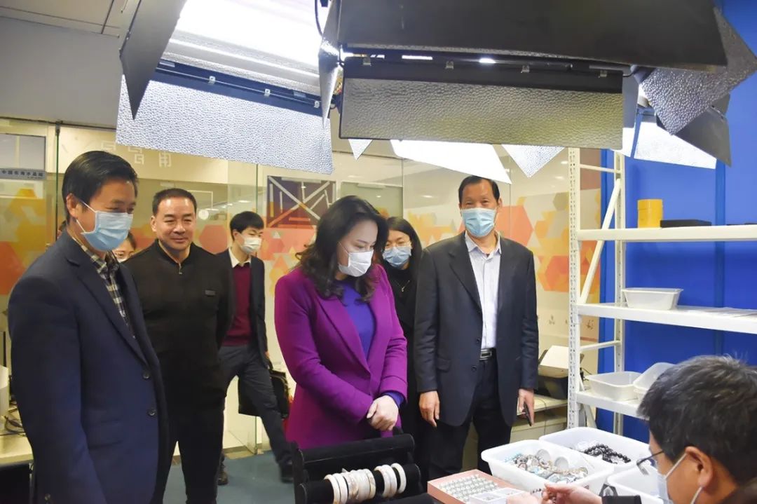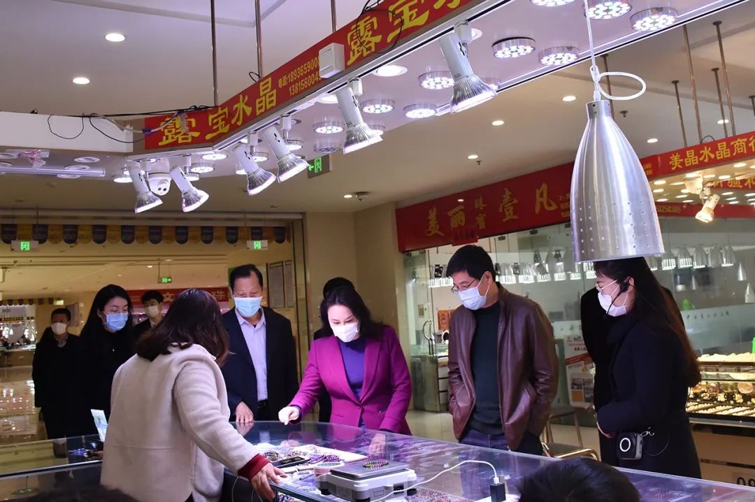 随后,参观组一行先后来到至善坊、电商双创基地、网红直播间等,不时驻足询问、聆听,对水晶饰品种类、水晶雕刻工艺、销售模式表示赞叹。