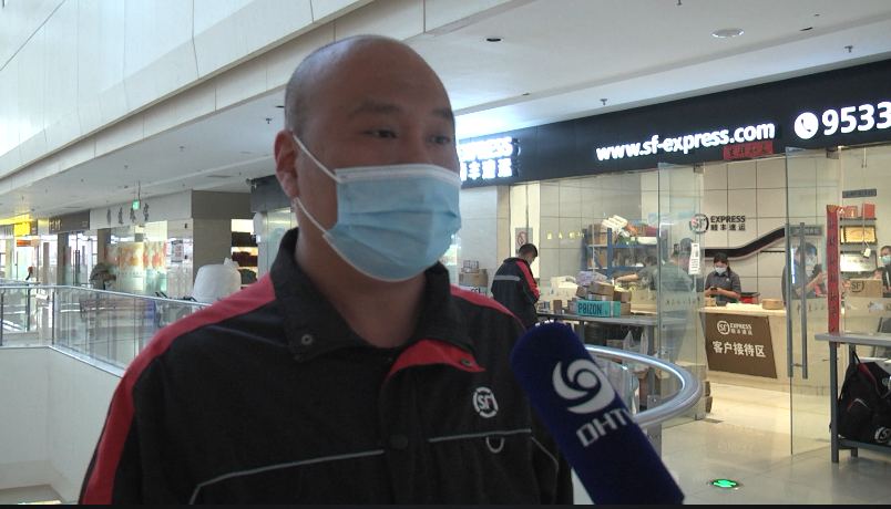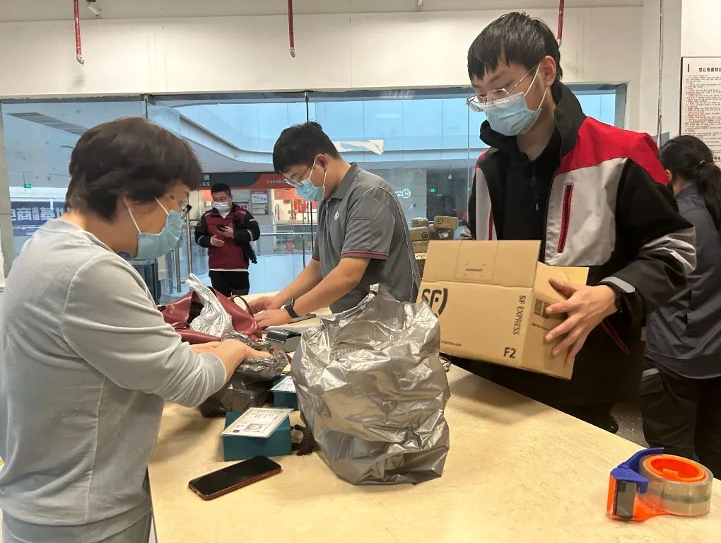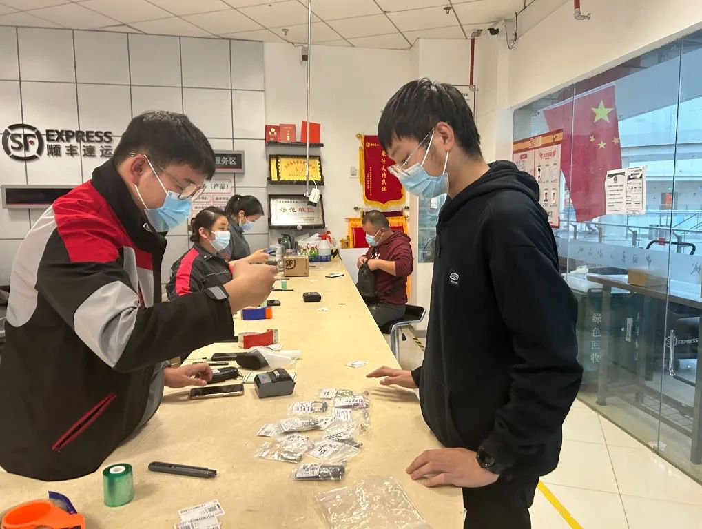 在顺丰速递网点,定制包装箱、循环包装箱、窄胶带、气泡膜等包材一应俱全,工作人员正在为前来寄递首饰的客户做好验视等各项服务。