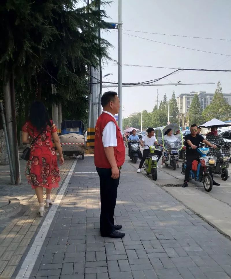 他们身穿红马甲、在路口劝阻非机动车闯红灯、停车越线、逆向行驶,行人走机动车道、翻越护栏等不文明交通行为。倡导市民安全出行、文明出行,改善交通秩序。