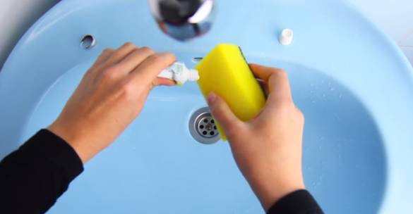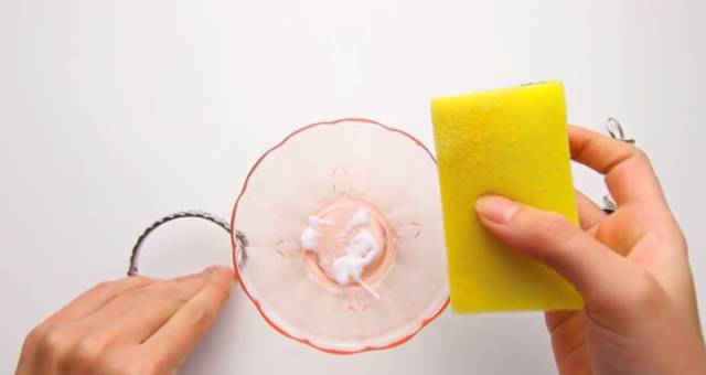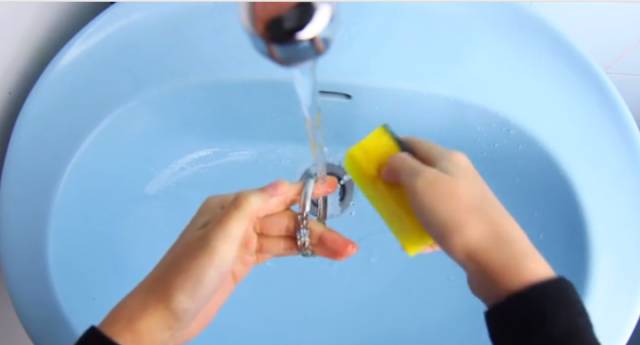 用海绵蘸取稀释后的清洗剂,擦拭首饰