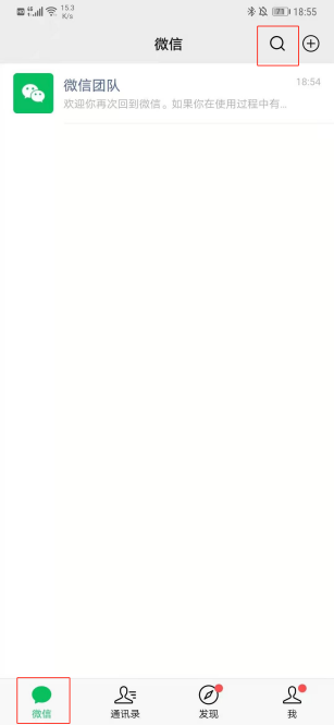 1.打开微信APP,点击首页右上角打开搜索功能;