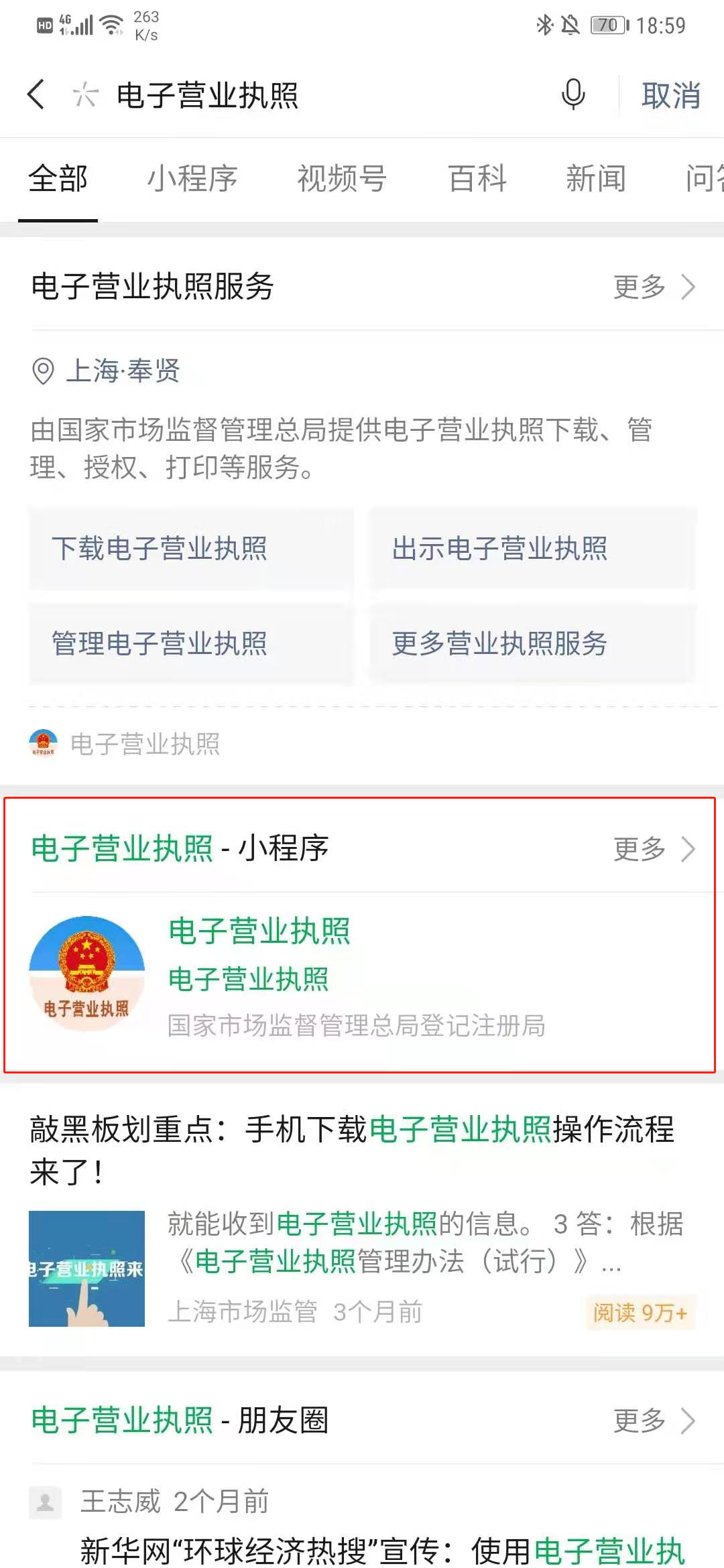 3.在搜索栏中输入“电子营业执照”,即可以查询出 “电子营业执照”小程序;