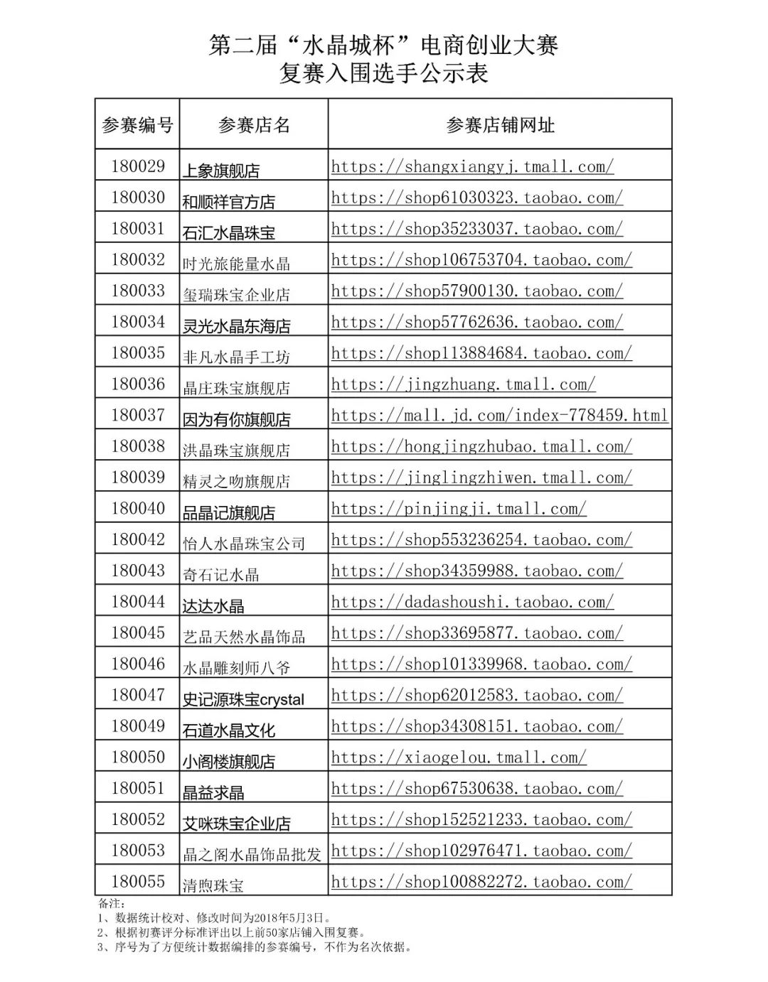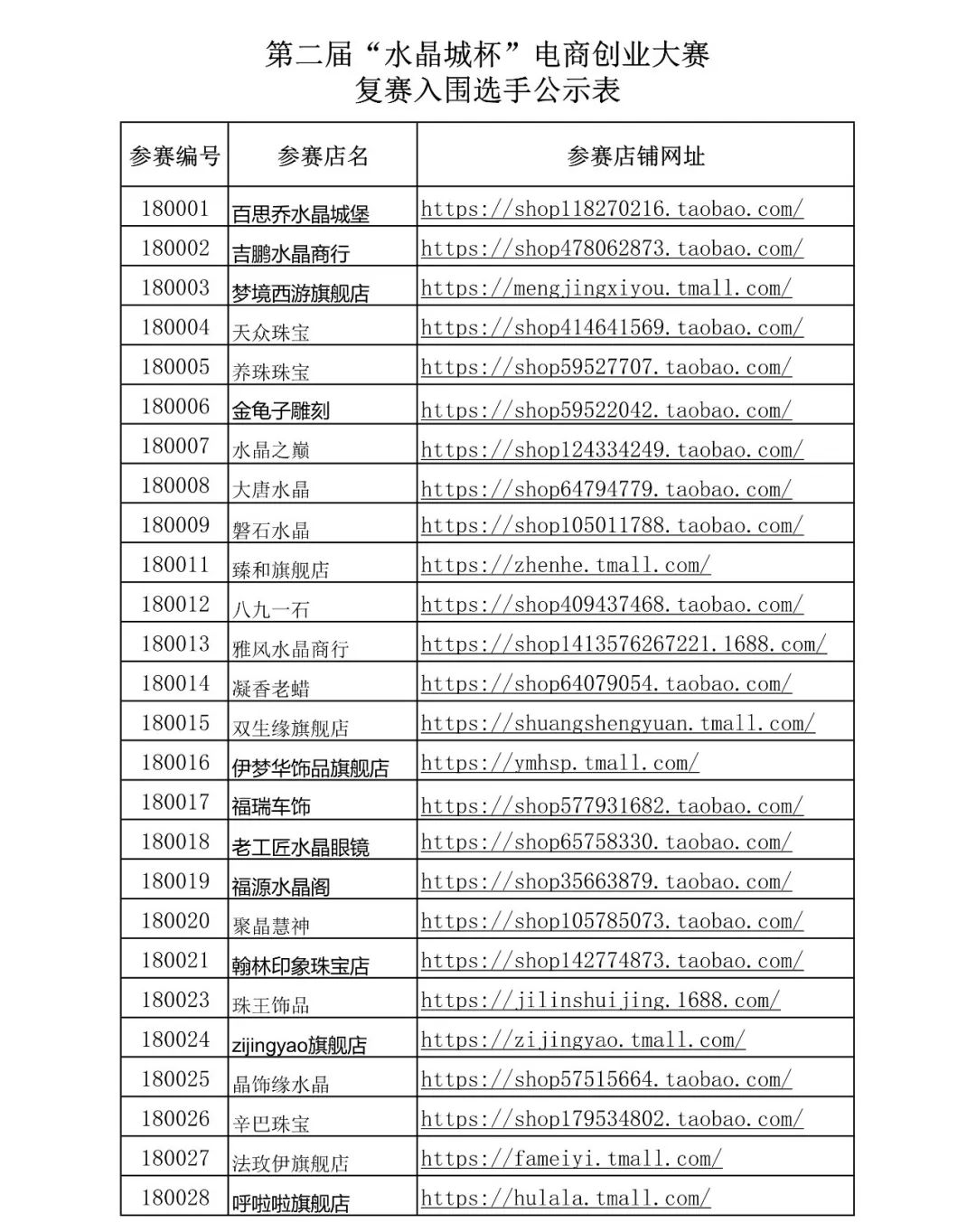 第二届“水晶城杯”水晶电商创业大赛,初赛评选已结束,共有50名选手通过自己的努力拼搏,入围复赛,在此我们向入围选手表示衷心的祝贺。现将比赛结果、入围名单予以公示: