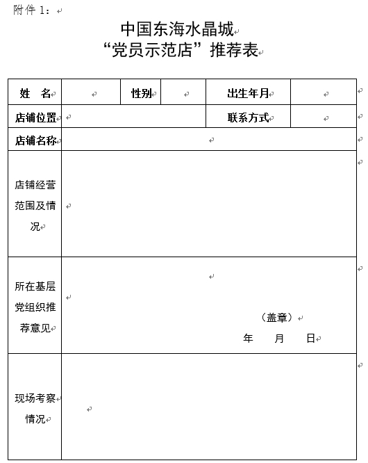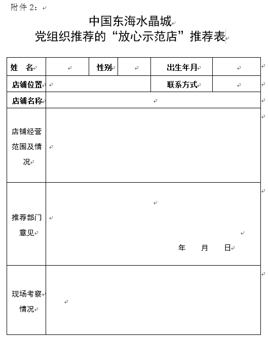 2、中国东海水晶城党组织推荐的“放心示范店”推荐表