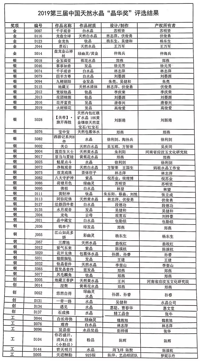 为充分展示当代天然水晶雕刻品、观赏石、饰品的最高技艺水准及最新的设计创意,加强国内外水晶创作人员的交流,全面提升设计创作水平,弘扬水晶文化,推动水晶产业持续健康发展,中国珠宝玉石首饰行业协会和东海县人民政府共同主办了2019年第三届中国天然水晶“晶华奖”评选活动。本届活动由中国珠宝玉石首饰行业协会水晶分会、江苏东海水晶产业投资发展有限公司、东海县科教创业园区、东海县水晶宝石行业协会具体承办。
