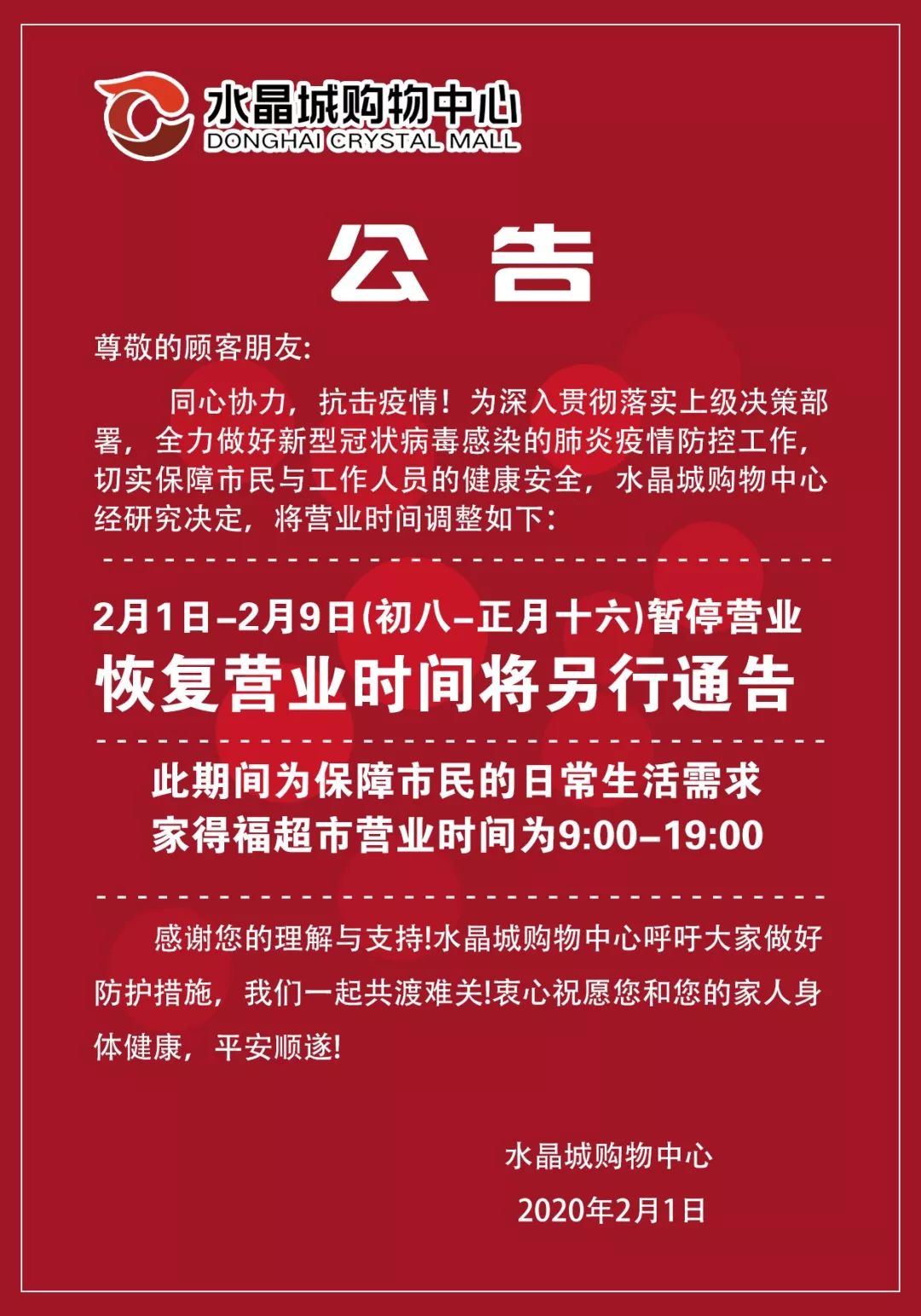 面对新型冠状病毒疫情,家得福超市积极投入公共卫生预防工作,每日对电梯、卫生间、卖场、购物车、垃圾桶进行全面消毒。全体工作人员均佩戴口罩,增加购物篮、车、电梯扶手、卖场地面、卫生间等清洁消毒频次。配合消毒洗手液,提醒员工、顾客注意个人卫生,重点加强家禽类、蔬菜类商品的管控工作,积极配合政府部门做好疫情防疫工作。严格按相关操作流程、规范、标准执行,为顾客提供一个安全、舒适的购环境。