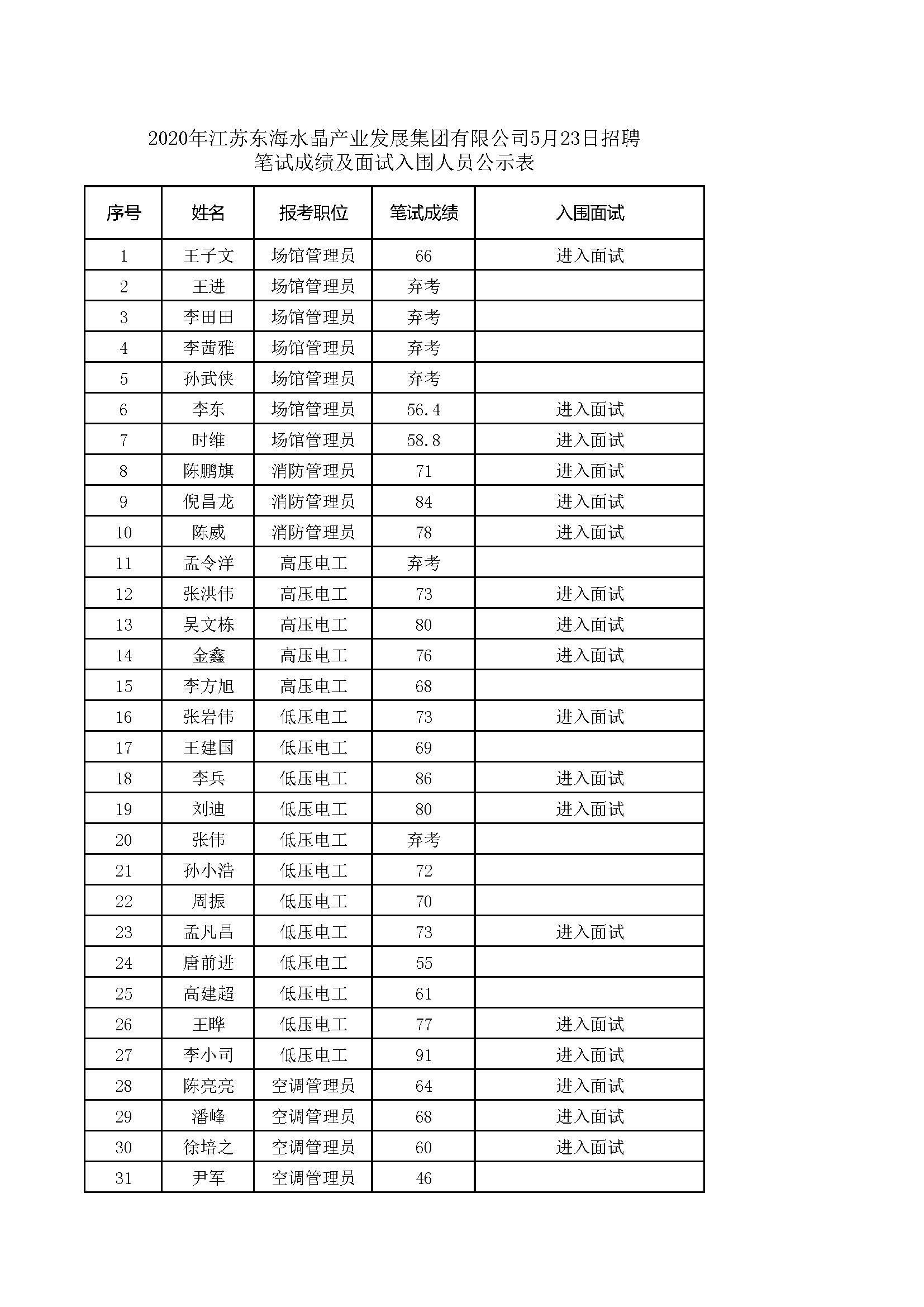 附件:2020年江苏东海水晶产业发展集团有限公司5月23日招聘笔试成绩及面试入围人员公示表