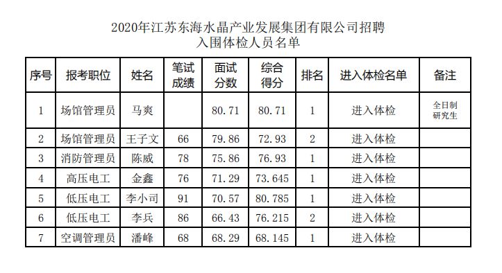 2020年江苏东海水晶产业发展集团有限公司招聘入围体检人员名单