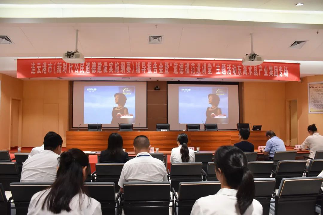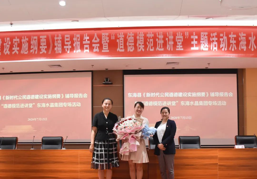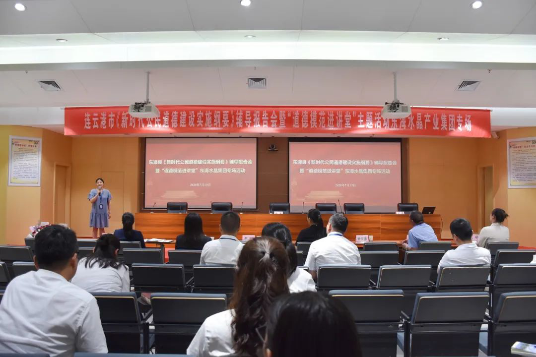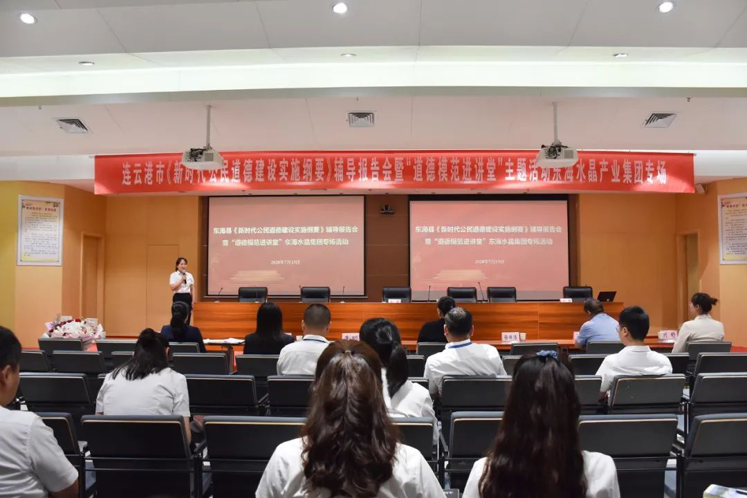 为深入开展新时代公民道德建设,引导广大员工积极弘扬和践行社会主义核心价值观,构筑晶城道德风尚建设高地。7月13日,东海县《新时代公民道德建设实施纲要》辅导报告会暨“道德模范进讲堂”走进东海水晶集团。东海县委宣传部副部长、县文明办主任潘婷婷同志,东海县文明办公民道德建设科科长徐田浩同志,县委党校冯同旺老师,江苏好人、江苏省最美抗疫家庭、连云港市援鄂医疗队队长、东海县人民医院ICU护士长刘舒同志,东海水晶集团党委书记、董事长李明同志参加活动。