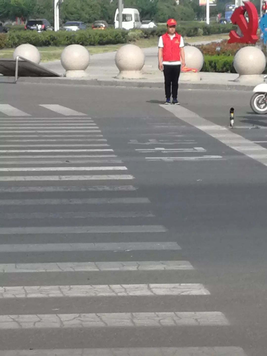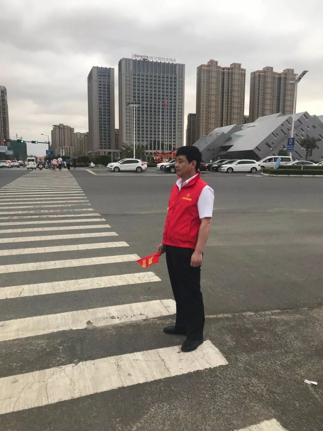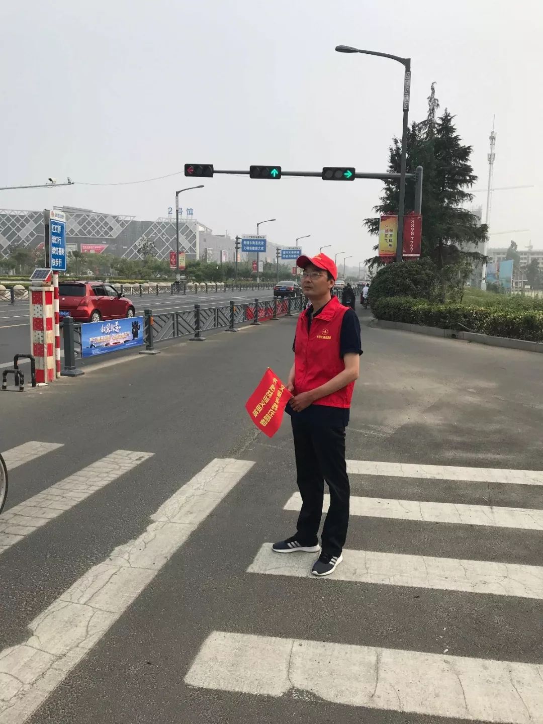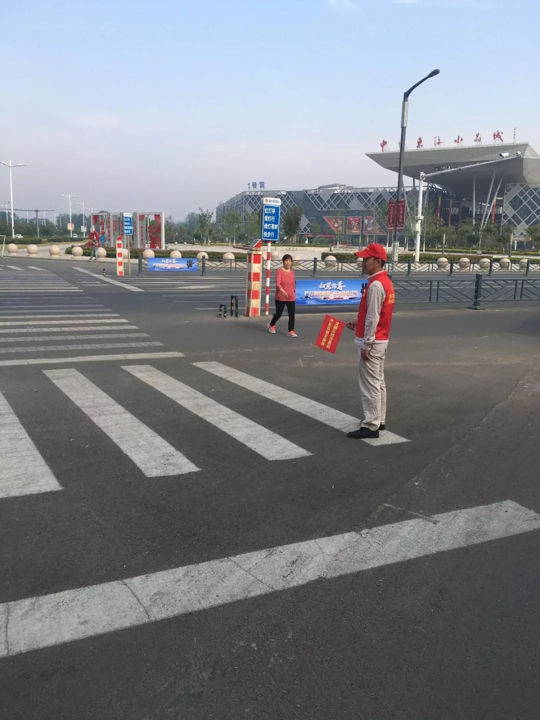 身着红马甲、手拿引导旗、头戴小红帽