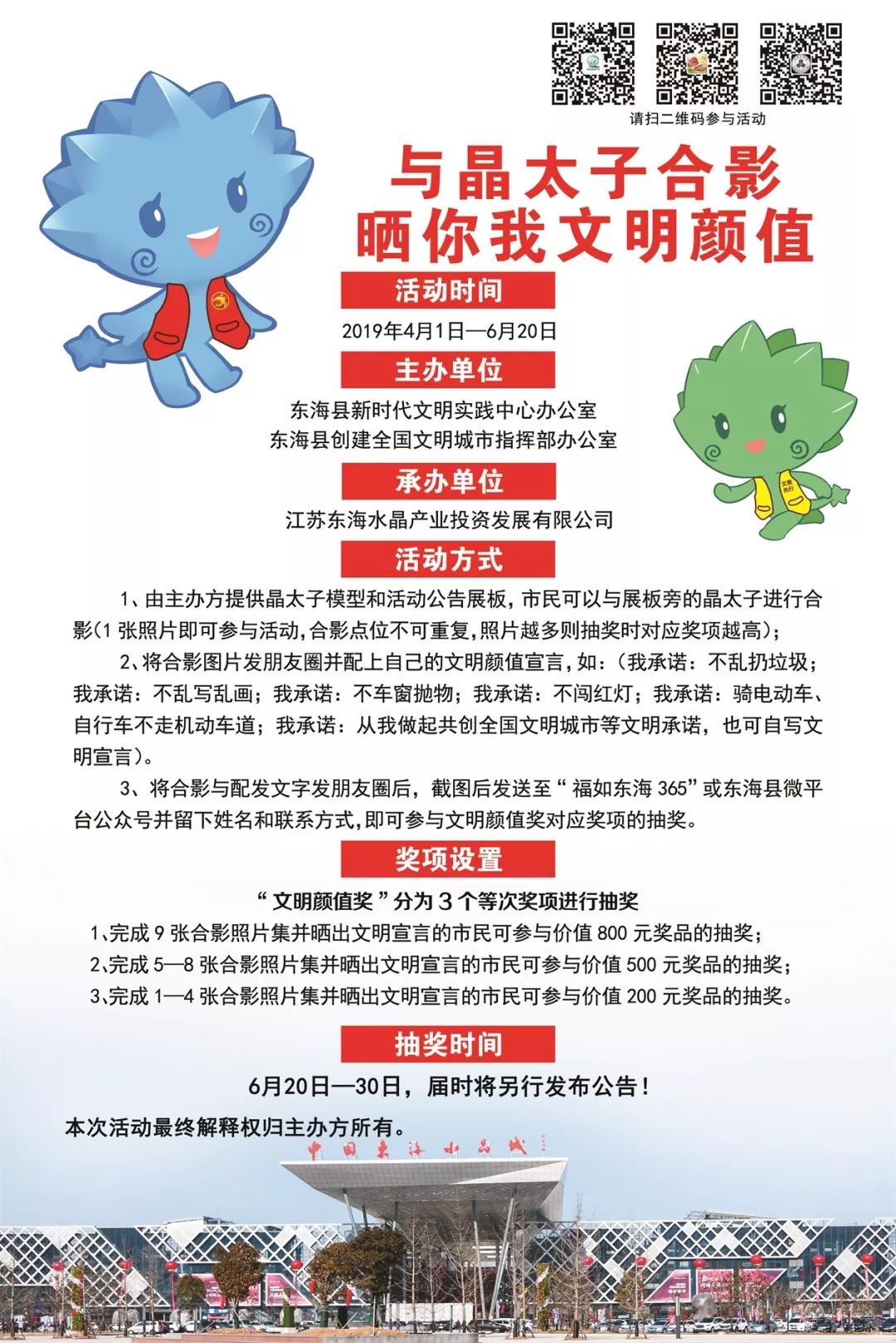 2、完成5—8张合影照片集并晒出文明宣言的市民可参与价值500元奖品的抽奖;