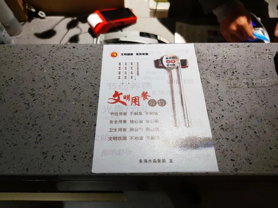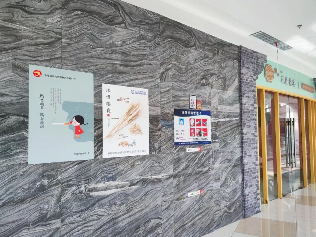 东海水晶集团工作人员于场馆内、员工食堂张贴宣传海报。