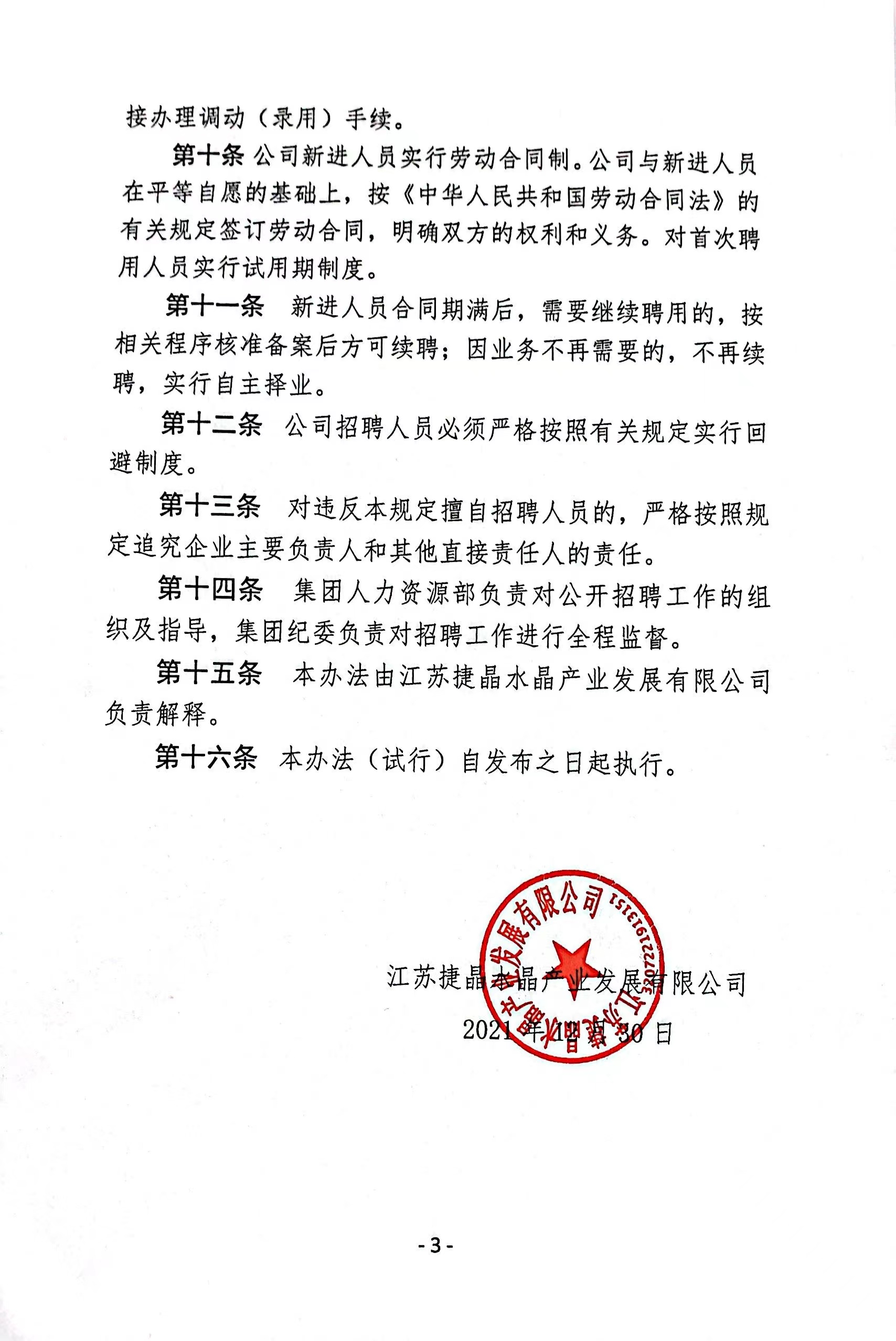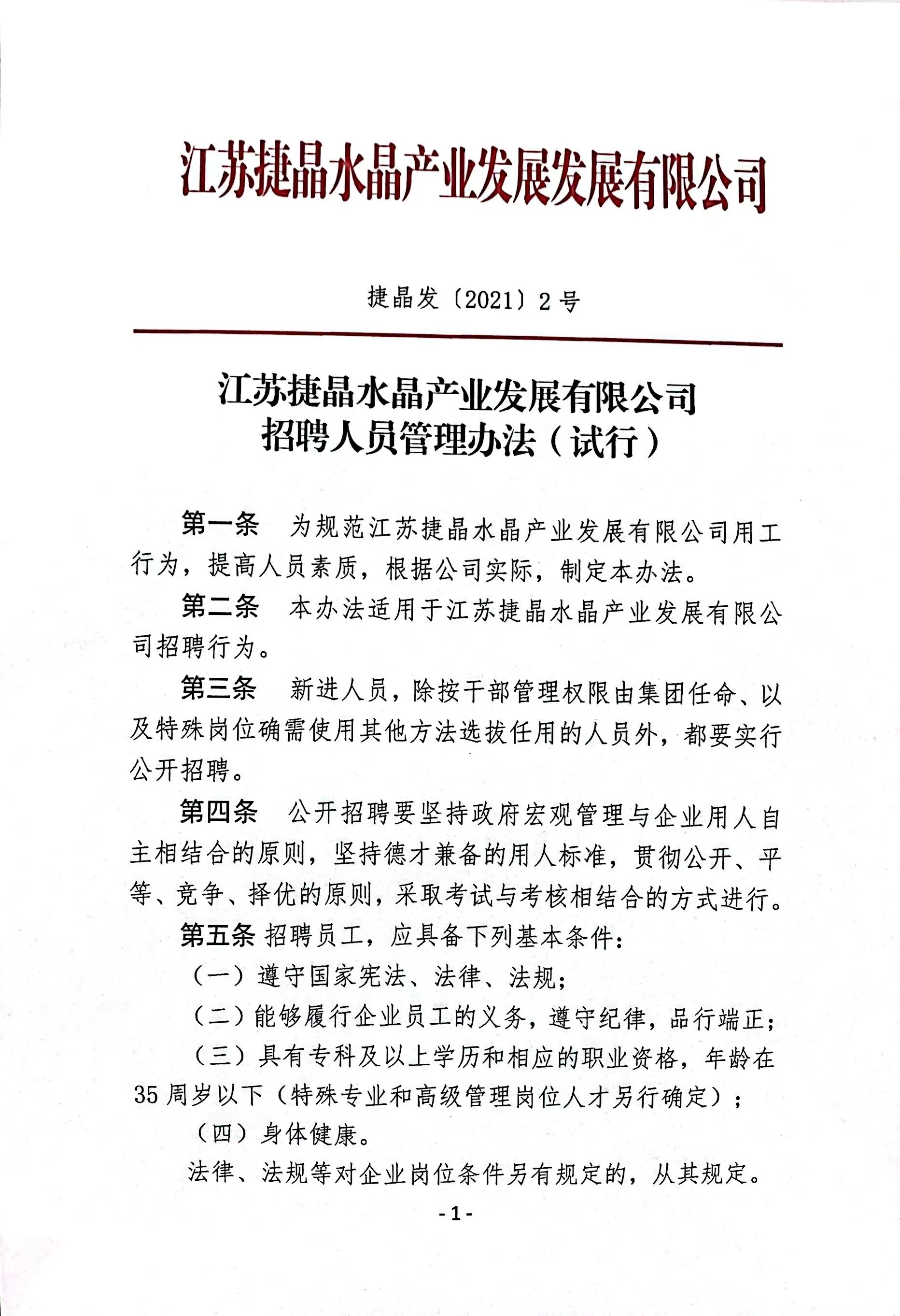 江苏捷晶水晶产业发展有限公司招聘人员管理办法(试行)