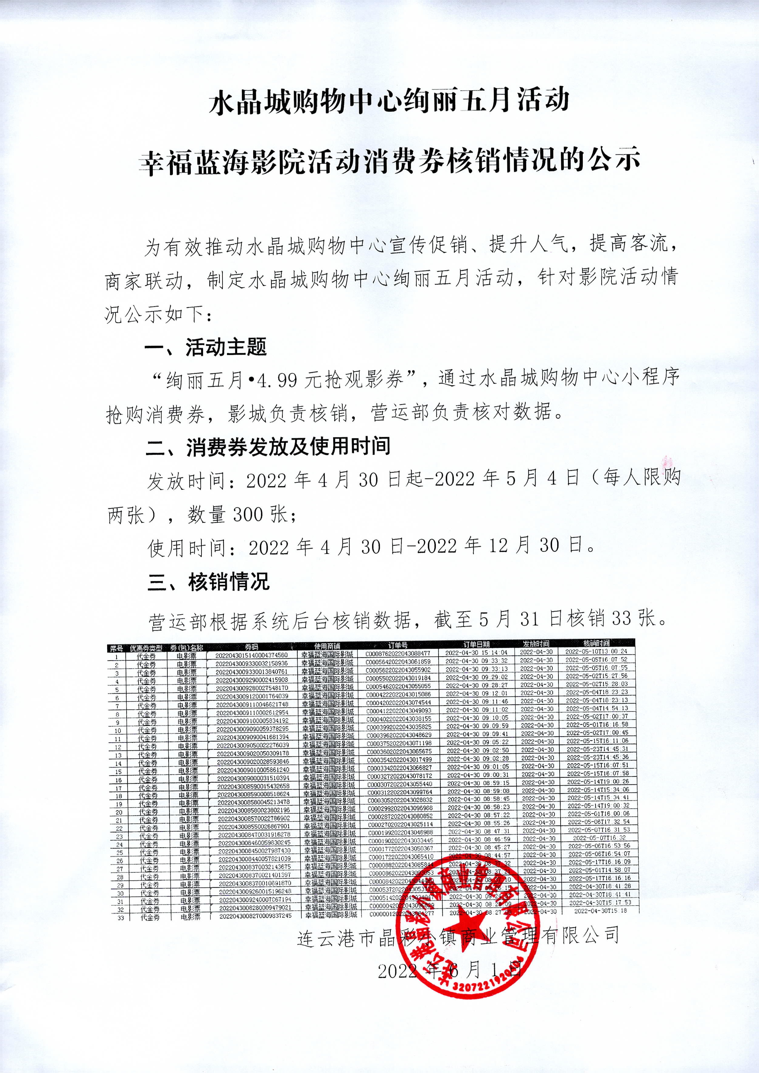 晶彩小镇商业管理有限公司-水晶城购物中心绚丽五月活动幸福蓝海影院活动消费券核销情况公示