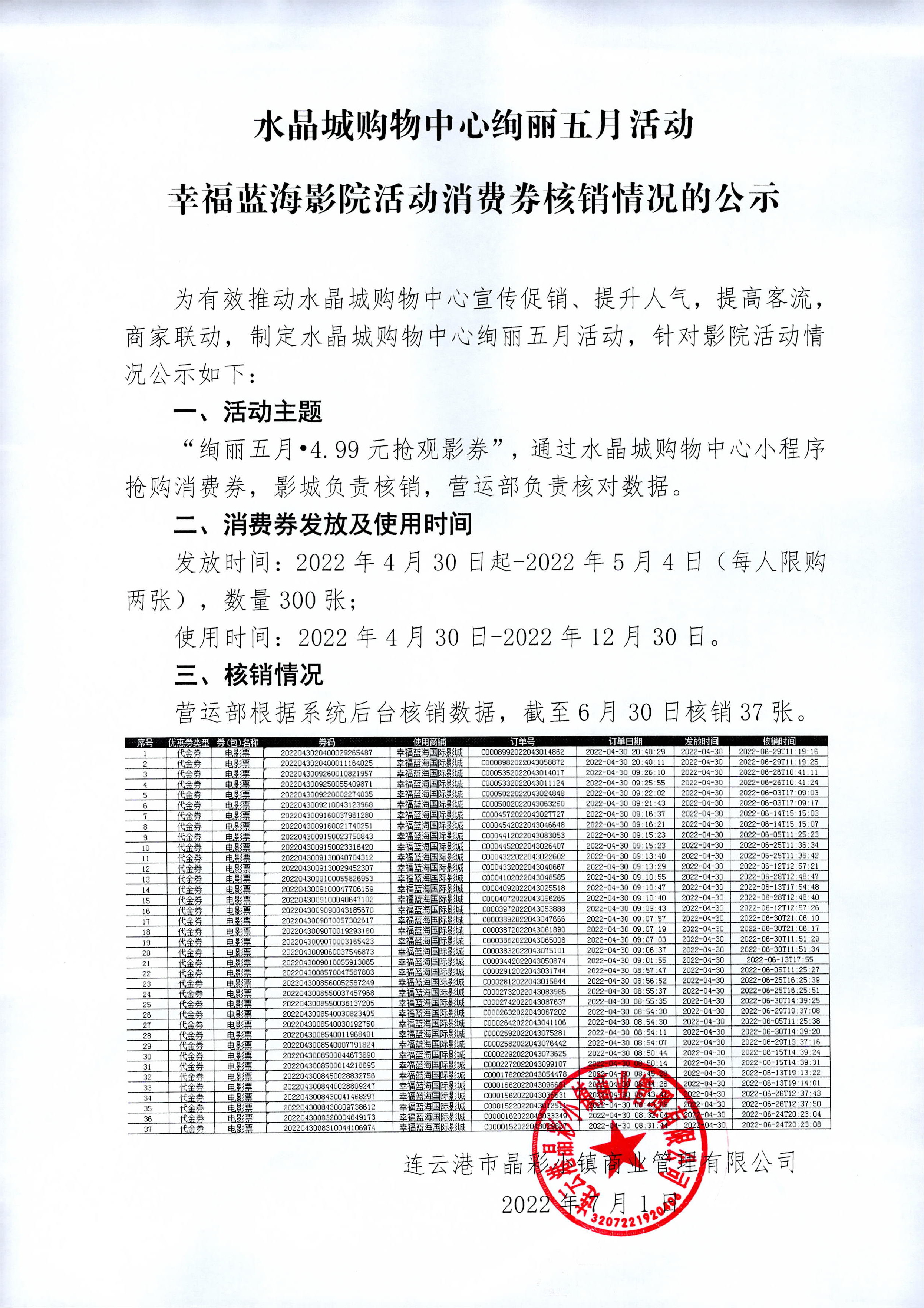 晶彩小镇商业管理有限公司-水晶城购物中心绚丽六月活动幸福蓝海影院活动消费券核销情况公示