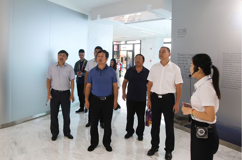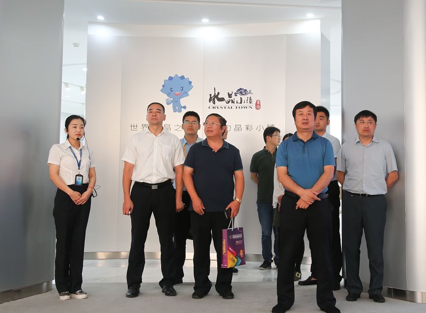 考察团一行首先来到水晶小镇客厅,详细听取了讲解员对我县水晶文化产业的基本情况、发展历史、产业转型升级的主要做法和发展经验情况的介绍,让考察团一行感触颇深,对小镇规划图、小镇沙盘、270°环屏等印象深刻,对当前小镇建设情况、设计定位、产业特色表示赞赏。