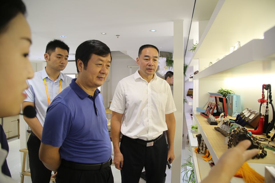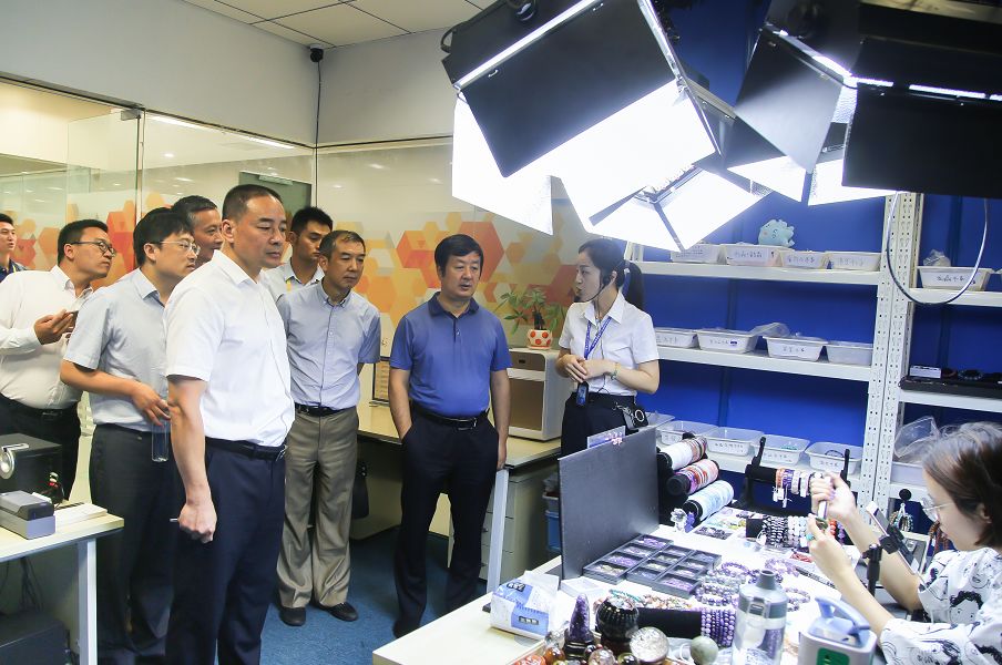 随后考察团一行来到网红直播室,现场观看了网红直播销售水晶。在淘宝自然免费流量越来越少,付费流量越来越贵的情况下,网红成为了新的吸引流量的入口,网红希望借电商变现,电商希望借网红引流。考察团对这一新兴销售模式边走边议。