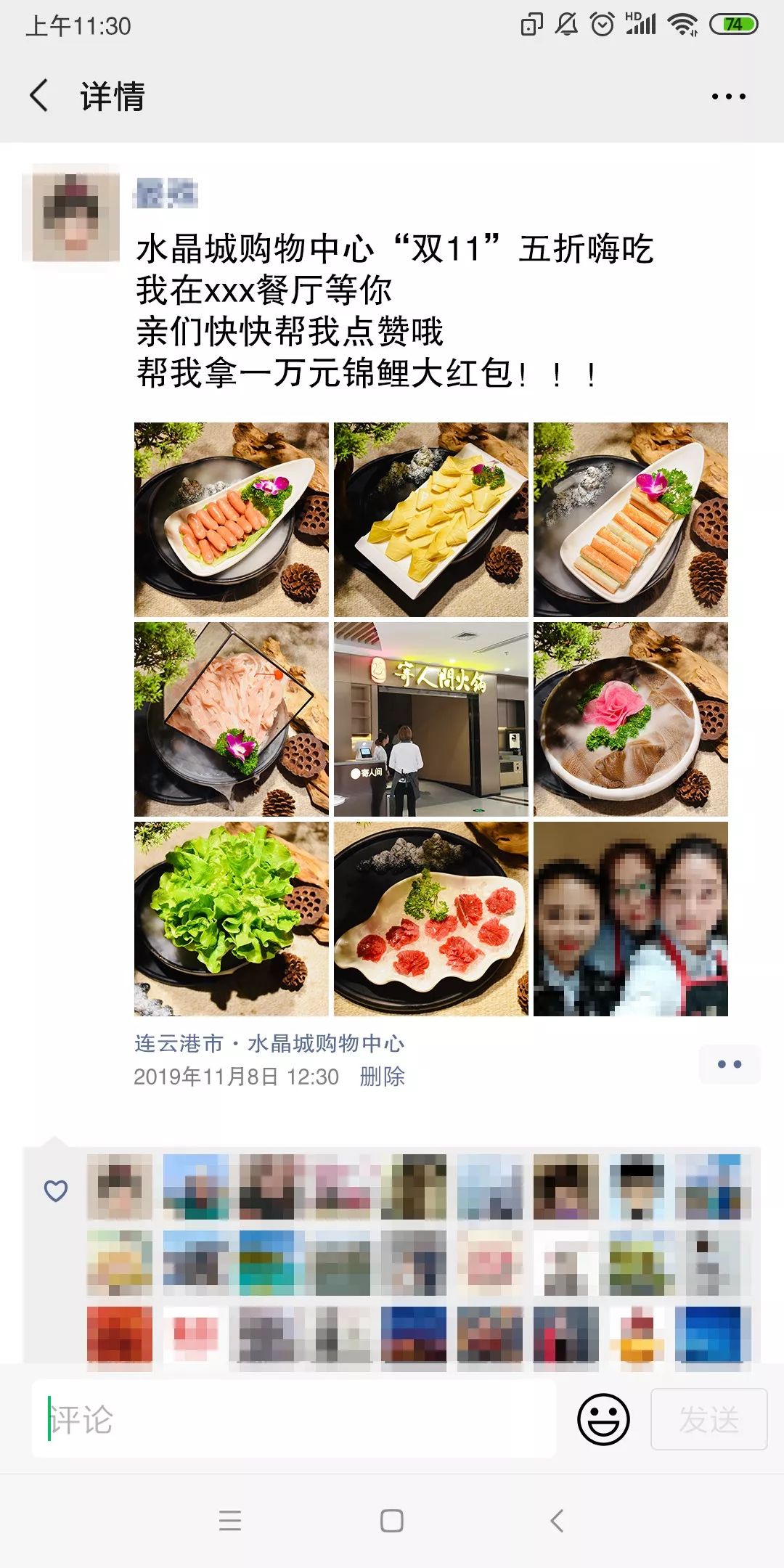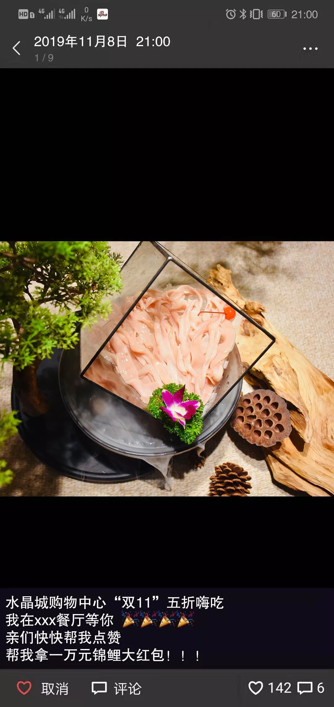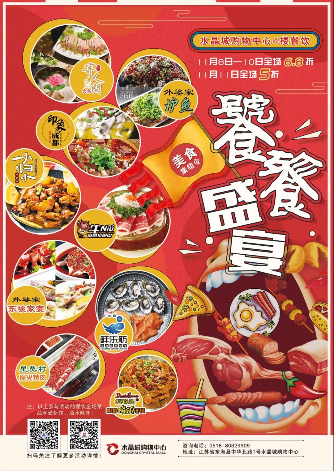 附文字“水晶城购物中心双11五折嗨吃,我在XXX餐厅等你”。