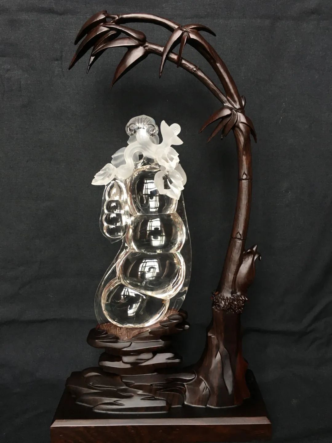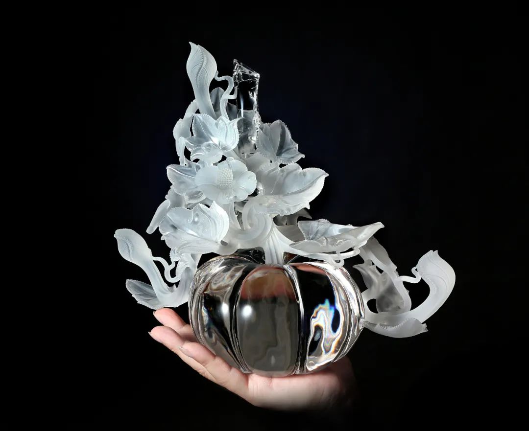 选用天然无色水晶雕刻而成,晶体澄澈无暇,主题层次清晰,布局疏密有致。取材于生活中常见的南瓜,南瓜器大饱满,给人以满足的视觉享受,用水晶来创作南瓜,以水晶技艺将工艺美与自然美相结合,呈现新时代工艺美术的创新魅力。南瓜器形硕大圆满,藤蔓缠绕而生,花蕊俏丽,叶片大而舒展,微风过处摇曳生姿,静中有动,动静结合。“叶”与“业”同音,故取名“大业有成”。在古代,家中余有南瓜是家庭小有富余的体现,以此寄意人生拼搏努力,博得大业有成。