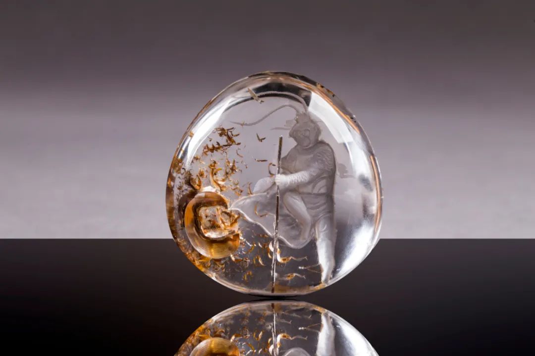 挑选水晶包裹体中极为罕见的金红石发意象包裹,结合水晶本体的胶花纯净体,其工艺难点在于美猴王的手部与金红石发(金箍棒)之间的镂空雕刻,巧妙的设计展现,将美猴王英勇无畏的气概表现得栩栩如生。美猴王在民间文化中是正义、智慧、勇敢和力量的化身。