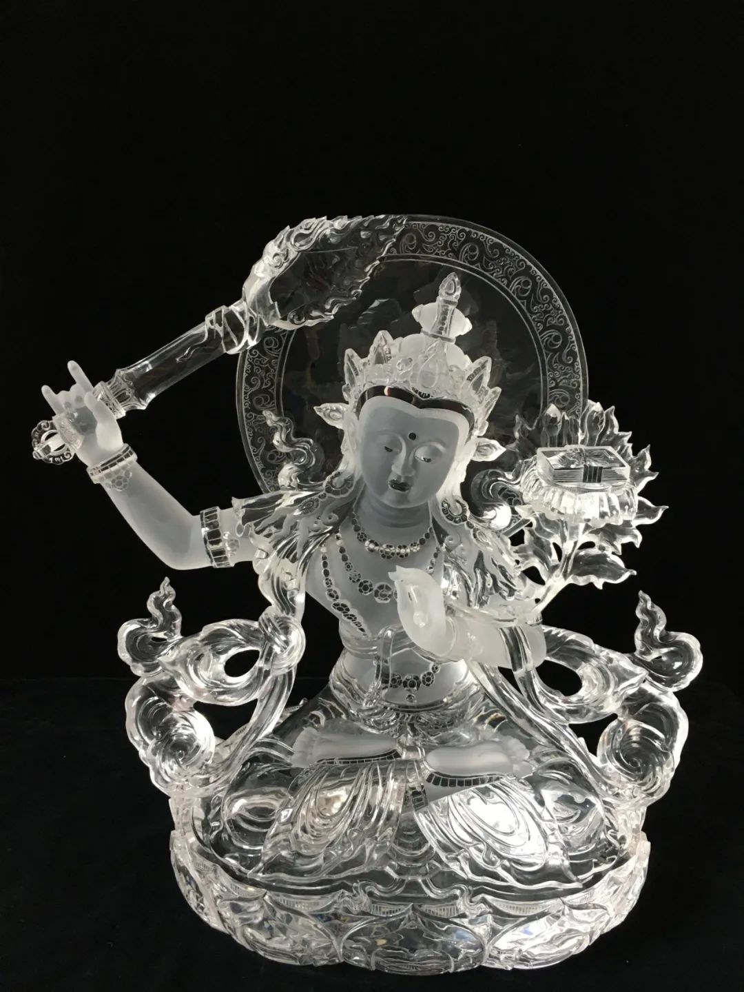选用天然水晶雕刻制作而成,采用传统风格设计理念与现代工艺相结合,运用圆雕技法打造。文殊菩萨是大智慧的象征,能开发智慧,提高悟性,尤其能帮助小孩学业有成,文殊菩萨是佛陀怙恃之一。文殊菩萨又称法王子,为智慧之象征,身紫金色,形如童子,五髻冠其项,右手持金刚宝剑(表示智能之利),能斩群魔,断一切烦恼,左手持青莲花,花上有金刚般若经卷宝,象征所具无上智慧。