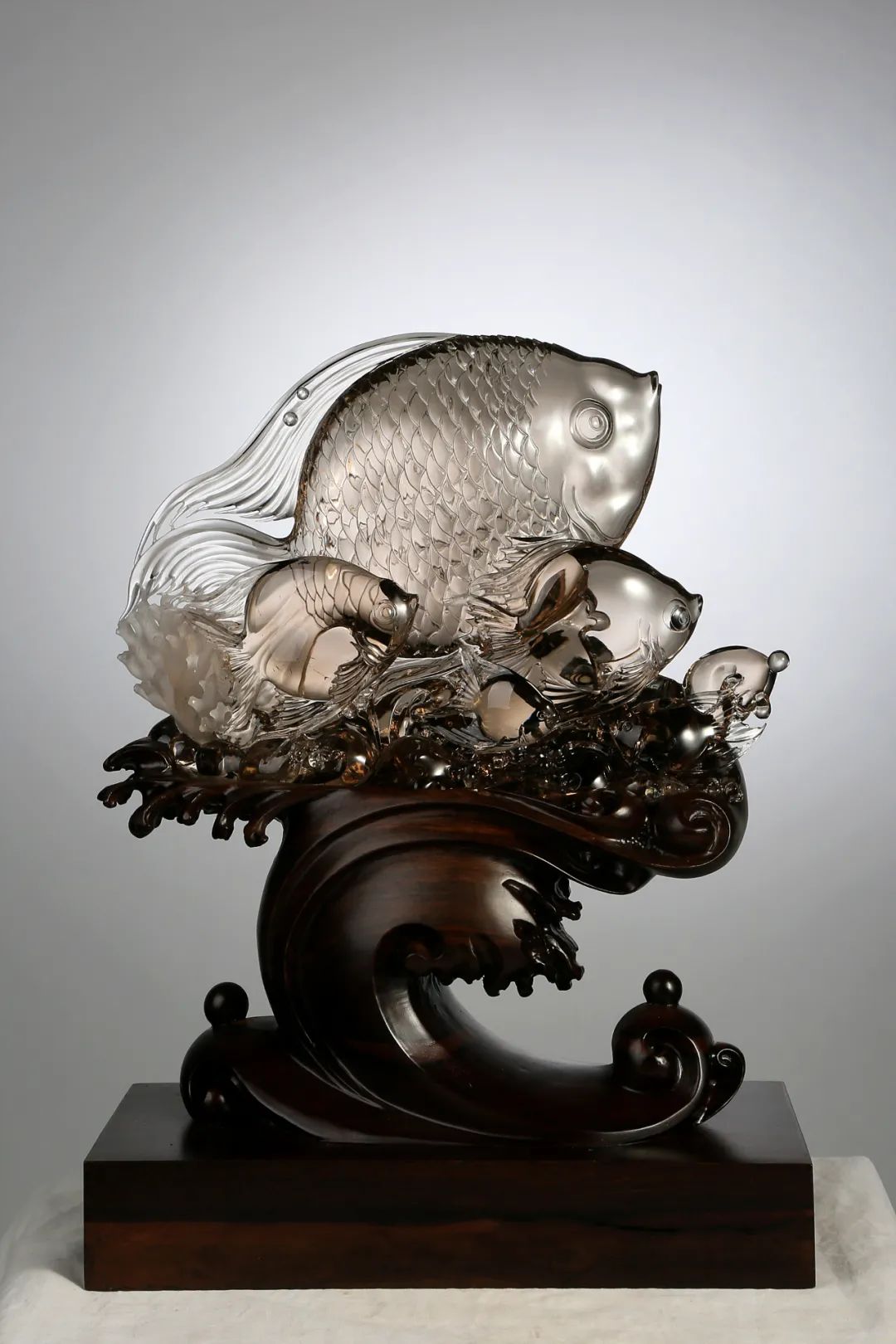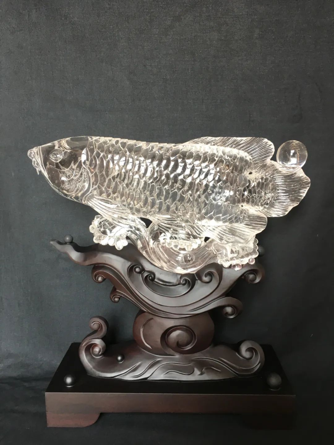 选用天然水晶雕刻制作而成,利用传统设计理念与现代工艺相结合,采用圆雕技法。金龙鱼具有很多美好的寓意,如其寿命很长,有“长命百岁、寿比南山”之寓意,其形神似龙,是无上权力、尊贵地位的象征。龙凤呈祥,暗含聚财、富贵之意。人们在龙鱼身上寄托了如此多的美好愿望。把它们作为最佳风水鱼请进千家万户,也就是一件必然之事了。
