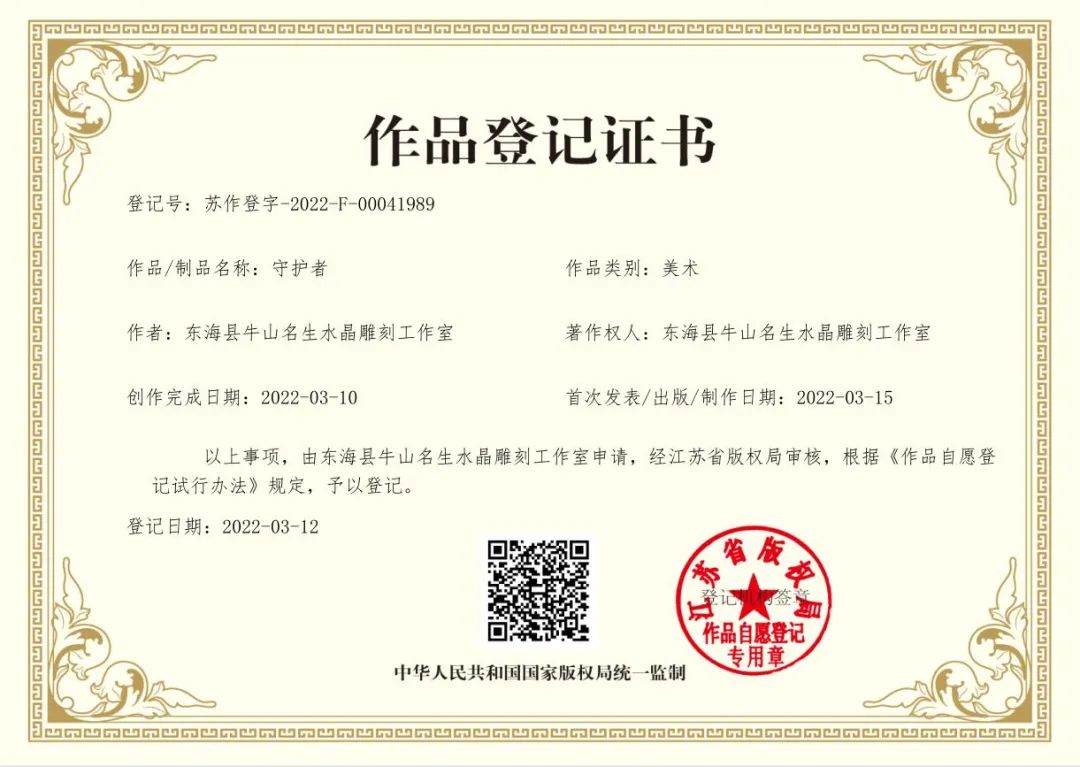 名生水晶雕刻工作室2007年成立于世界水晶之都东海县,由董新江、赵满意两位雕刻大师共同创办,注册于2016年位于东海县东蔡南路66/14号总面积500平方米,工作室现有高级职称1人,中级职称3人,初级职称1人,连云港市工艺美术大师2人,连云港市水晶雕刻大工匠1人,连云港市水晶雕刻技术能手1人,工作室2021年被连云港市人力资源和社会保障局评为连云港市乡土人才大师工作室,同年被东海县版权局评为先进企业,工作室研究传承水晶雕刻技艺,雕刻作品大多以传统文化技艺为主题,集文化创新、玉石雕刻、玉石抛光、配置底座等多项服务于一体。