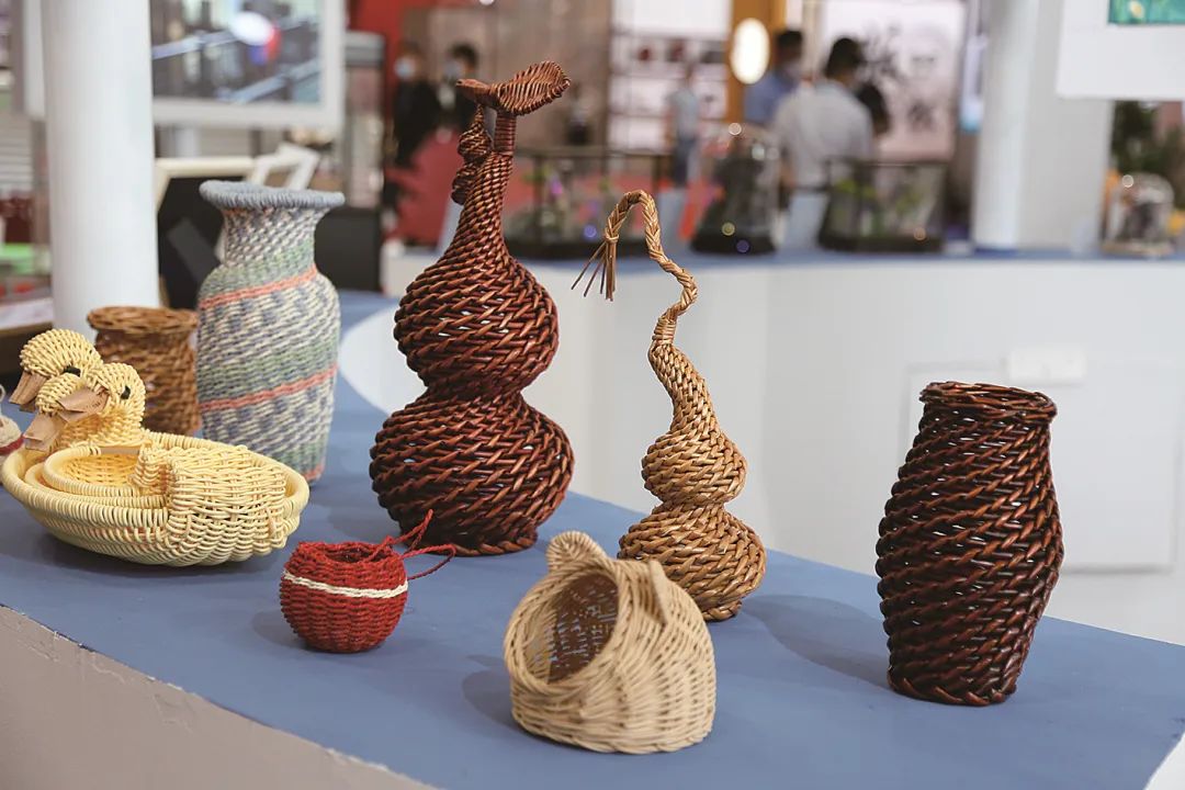 本届版博会中,我市不少非遗项目以令人耳目一新的方式亮相。如赣榆特色艺术作品主要是螺钿丝嵌《连云港贝雕》和静艺轩刻纸《剪纸》,来自灌云县双华藤柳编织专业合作社的柳编制品等。其中,螺钿丝嵌作品分为观赏瓶、挂画、台屏画、首饰盒、笔筒、茶杯等。静艺轩刻纸作品主要有十二生肖透明剪纸杯垫、西游记剪纸杯垫和西游记文化扇等。而灌云县双华藤柳编织专业合作社生产的藤编花篮、收纳篮、PE仿藤等系列产品除了亮相版博会外,还远销日韩、欧美,深受国内外客户欢迎。