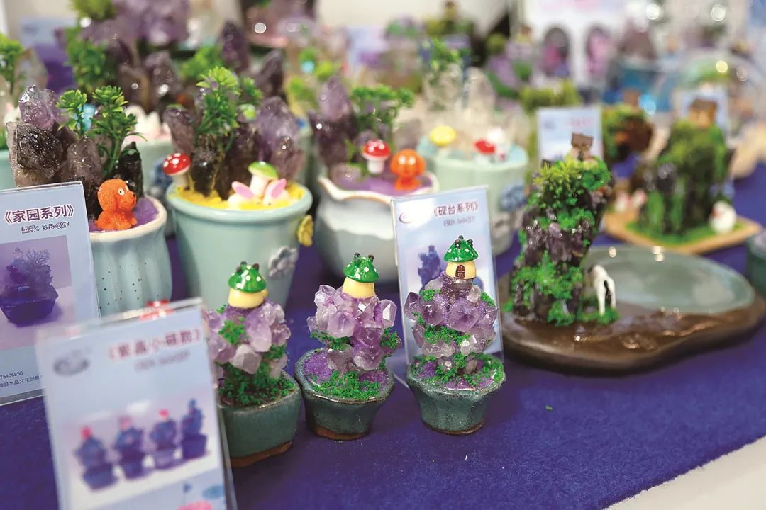 东海水晶雕刻是国家级非遗,在本届版博会的连云港展区,一排排精妙的水晶创意造景工艺品陈列开来,吸引了无数南京市民和游客驻足。梦幻的天然水晶,被设计在玻璃罩里,拨动开关,一闪一闪的灯光直接把氛围感拉满。这些吸人眼球的工艺品均来自俏艺坊工艺品有限公司以及东海县恒达珠宝有限公司等。据“俏艺坊”总经理戚飞生介绍,以前公司主要做水晶雕刻,现在拓展品类生产了天然水晶创意造景,可以放在办公桌上, 也可以当作礼品送人。产品远销东南亚、欧美。