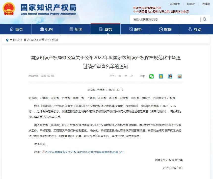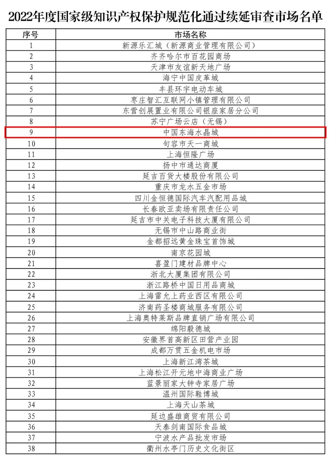 2月8日,国家知识产权局网站公布2022年度国家级知识产权保护规范化市场通过续延审查名单,中国东海水晶城位列其中。