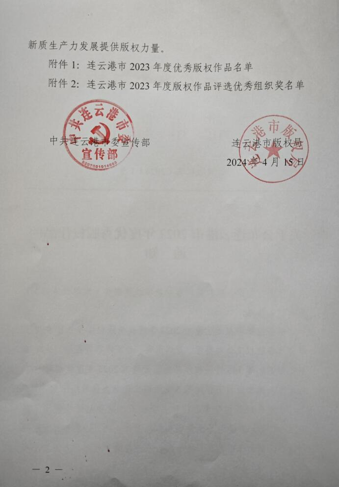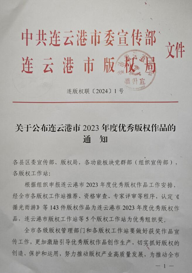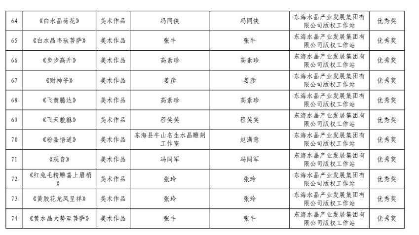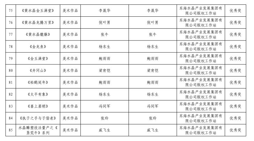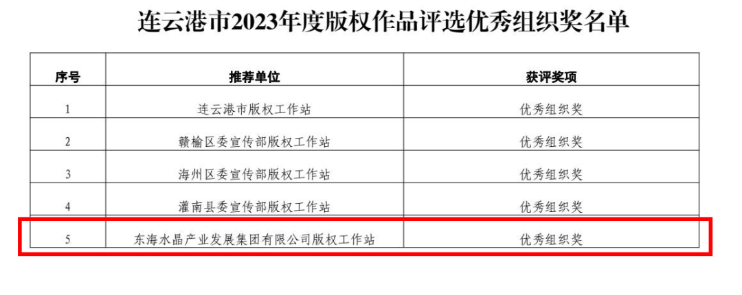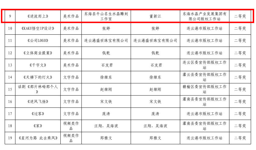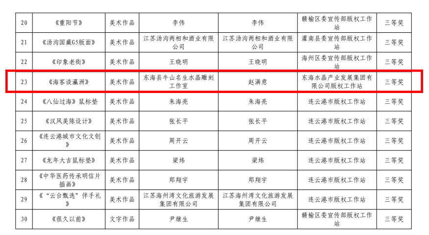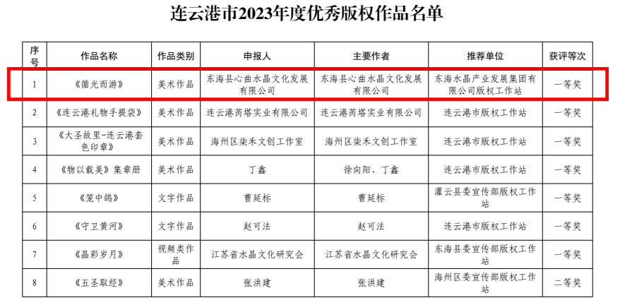 4月15日,中共连云港市委宣传部、连云港市版权局公布了连云港市2023年度优秀版权作品名单,由东海水晶城版权工作站推荐的多件水晶版权作品获奖,其中一、二、三等奖各1件,优秀奖22件。东海水晶城版权工作站获评优秀组织奖。